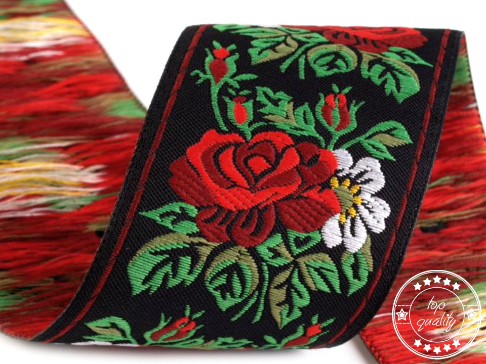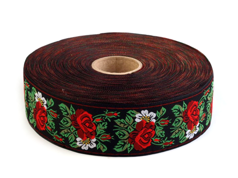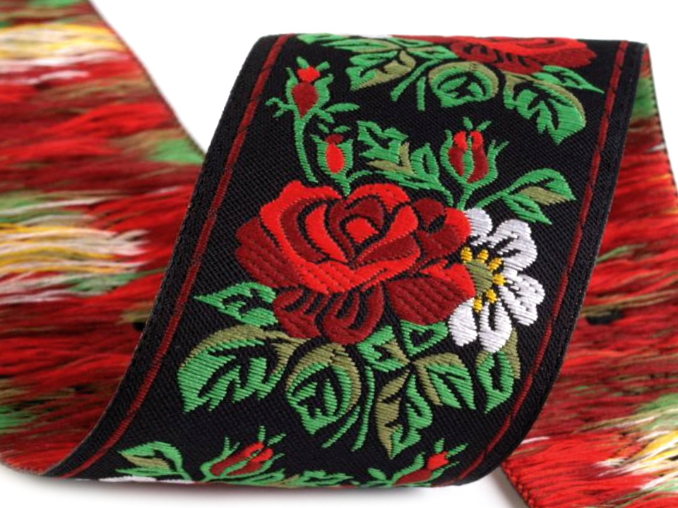 Krojová vzorovka je zdobená propracovaným motivem růží. Je tkaná na jehlovém stavu.