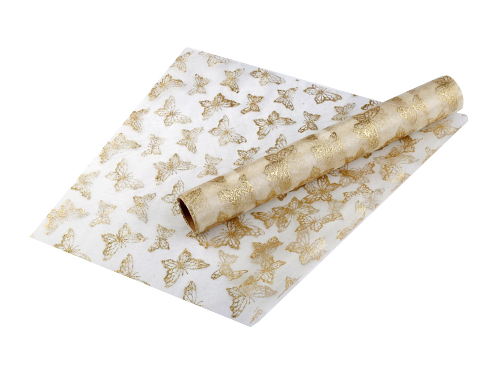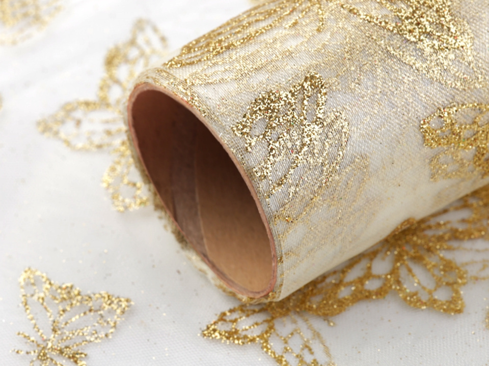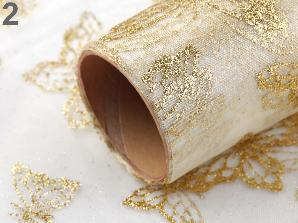 Jemně lesklá organza vypadá slavnostně a elegantně. Zdobí ji bohatý třpytivý potisk motýlů z glitrů, který působí luxusním dojmem. Kraje organzy nejsou obšité.
