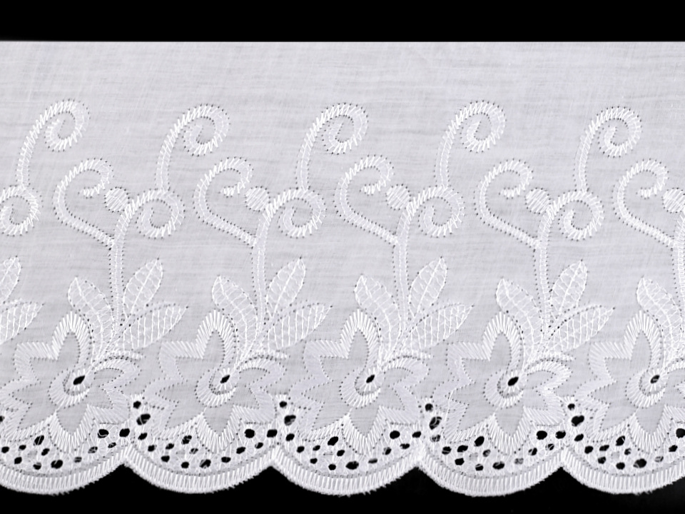 Širokou madeiru s atraktivním květinovým vzorem doplňuje dírková výšivka. Okraj zakončují malé obloučky.