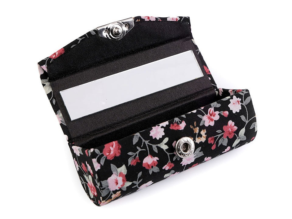 Je velice pevné, uvnitř má praktické zrcátko, díky kterému se můžete nalíčit kdykoliv a kdekoliv. Zapíná se na klasický patent, který zaručuje, že se pouzdro samovolně neotevře. Textilní potah má potisk drobných květů růží.