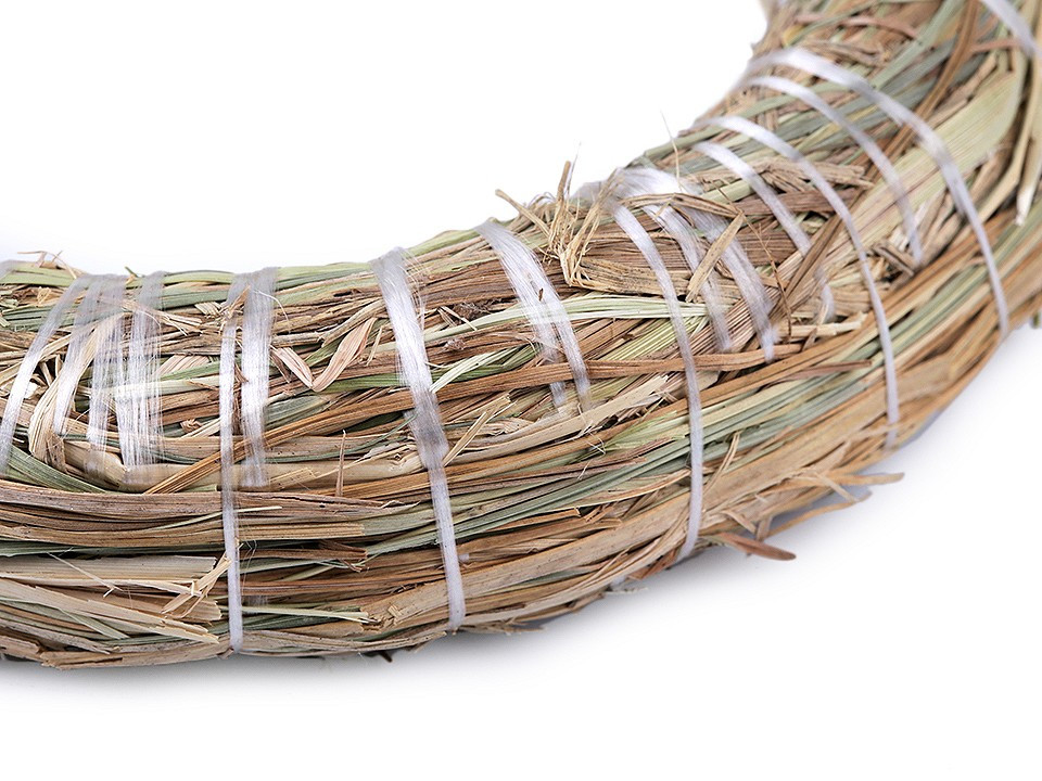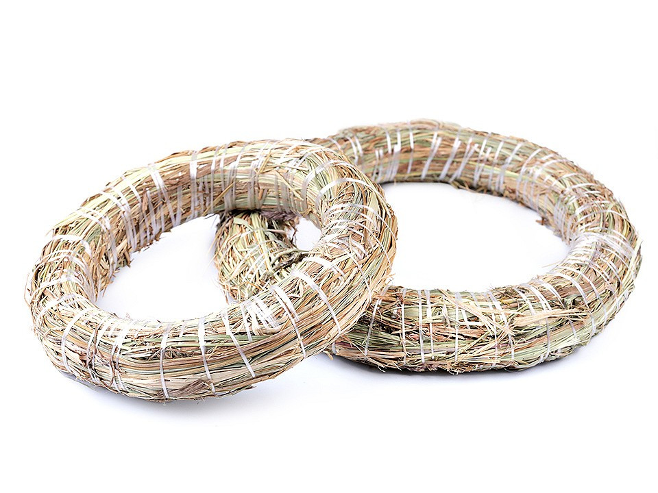 Slaměný věnec se perfektně hodí na aranžování a výrobu celoročních dekorací. Můžete kolem něj ovinout stuhu nebo ho ozdobit sušenými i umělými květy. Věnec je vhodný nejen k zavěšení na dveře a na zeď, ale také se bude vyjímat na stole.