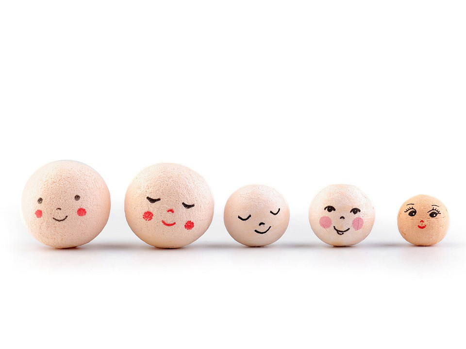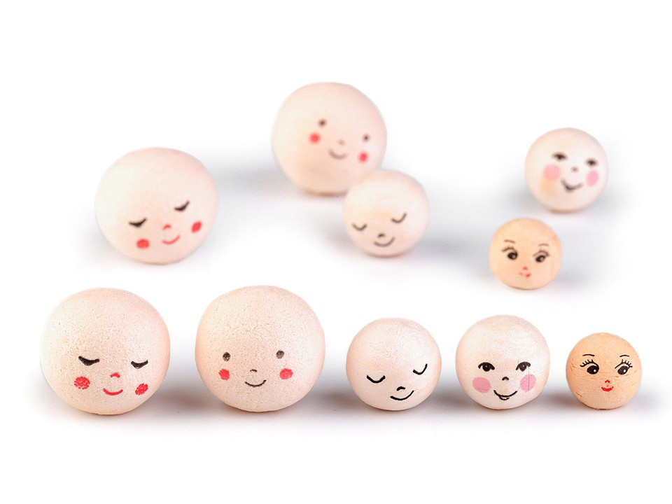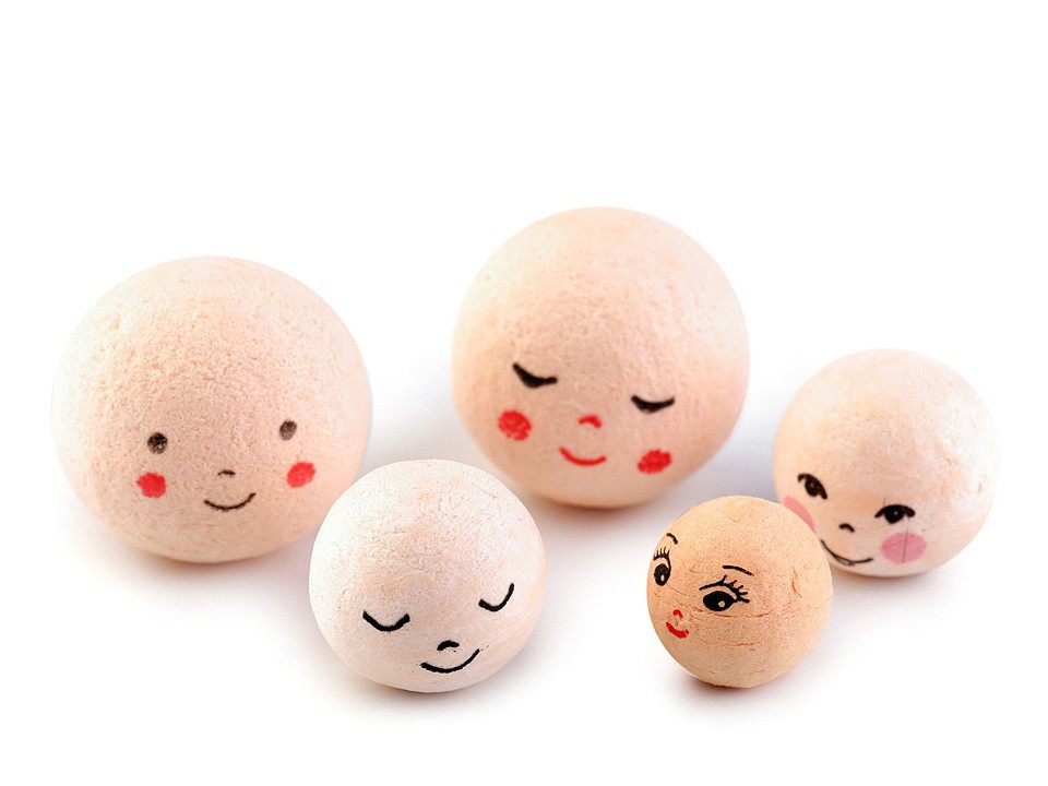 Mix vatových hlaviček s obličejem využijete na výrobu různých postaviček, panenek, loutek, maňásků apod. Hlavička má zespodu malý otvor, do kterého můžete zapíchnout špejli či drátek a umístit například do květináče.