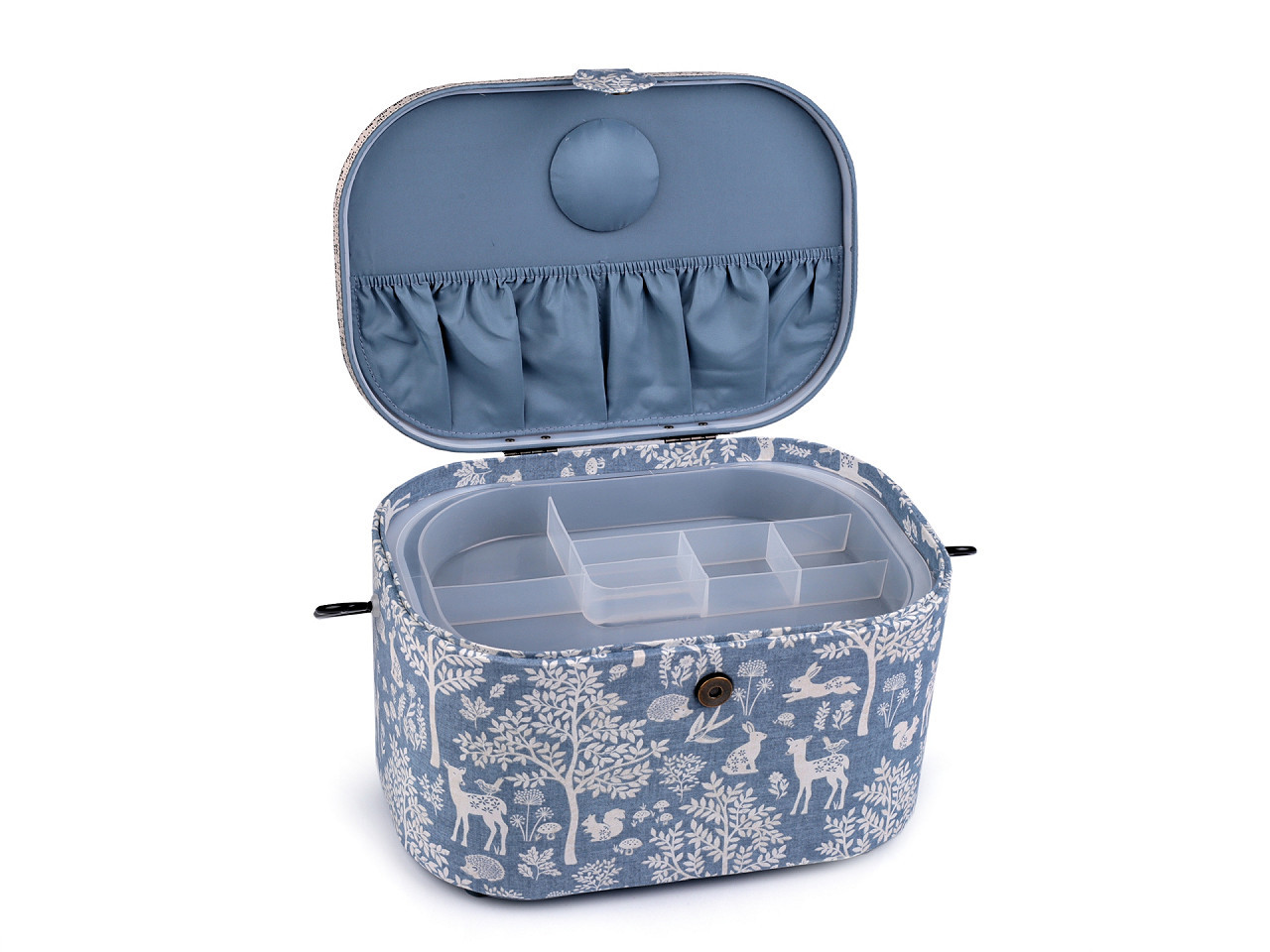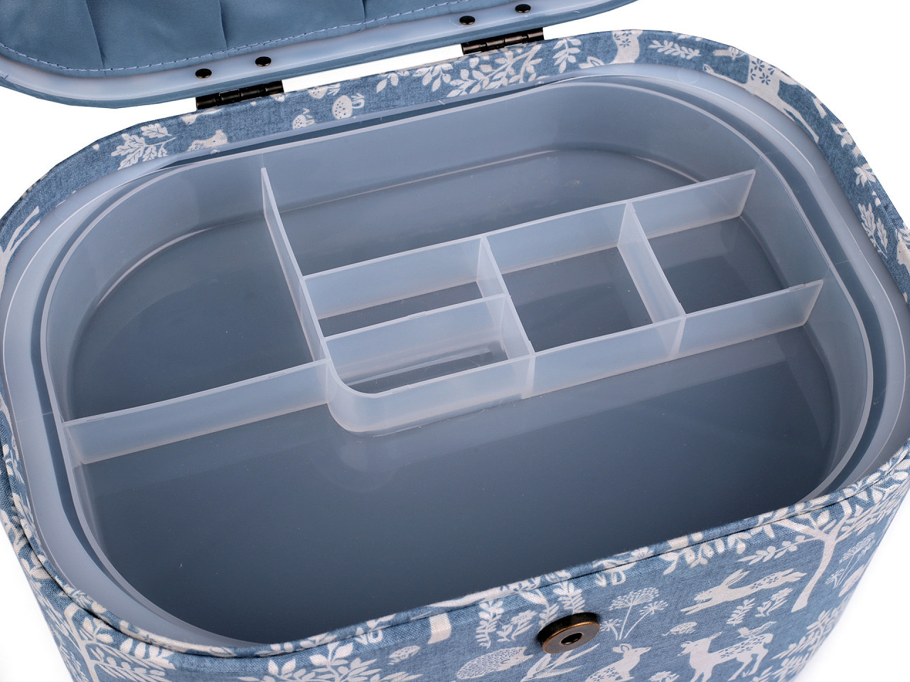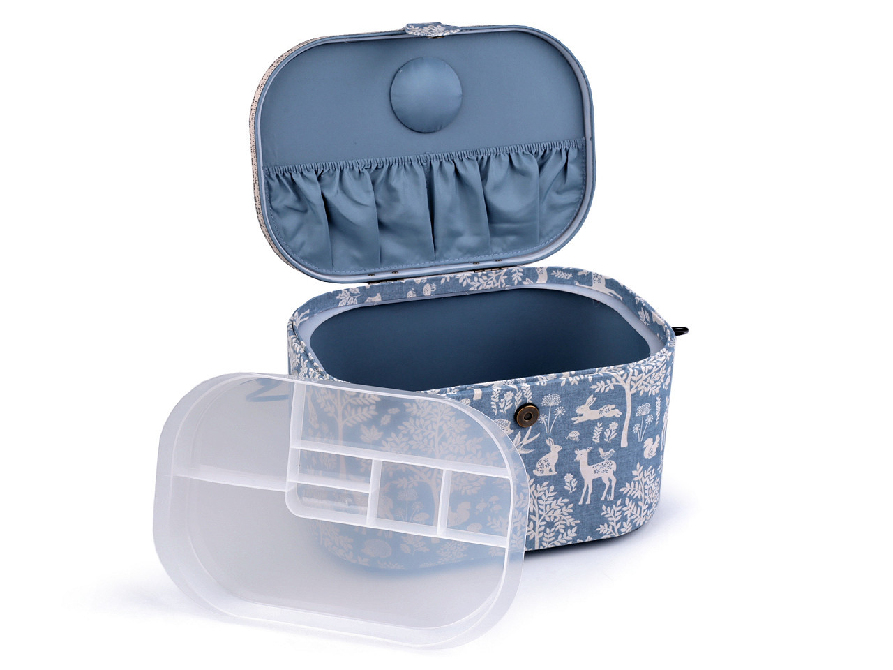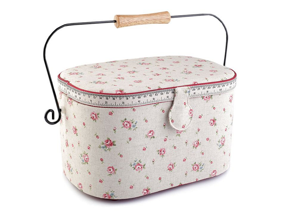 Do čalouněného košíku s potiskem růžiček se vám vejde plno šicích potřeb. Uvnitř se nachází praktické odnímatelné patro z průhledného plastu, které má 1 velkou a 6 malých přihrádek. Ve víku jsou 2 textilní kapsy a kulatý jehelníček. Košík se zapíná na magnetický patent, má kovové madlo s dřevěnou rukojetí na pohodlné přenášení. Dole jsou 4 nožičky ve tvaru kuliček.