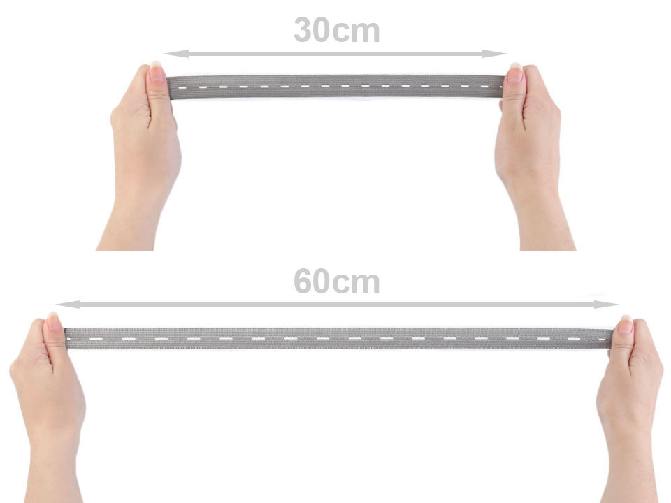 Použití: Pruženka je vhodná na zřasení lemu. Na vnitřní stranu látky přišijete knoflíky a připnutím na dírku regulujete zřasení. Využijete ji také na regulaci pasu kalhot či sukní.