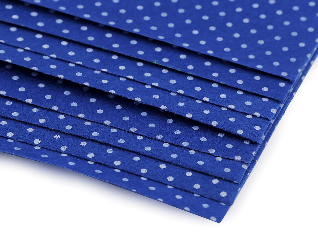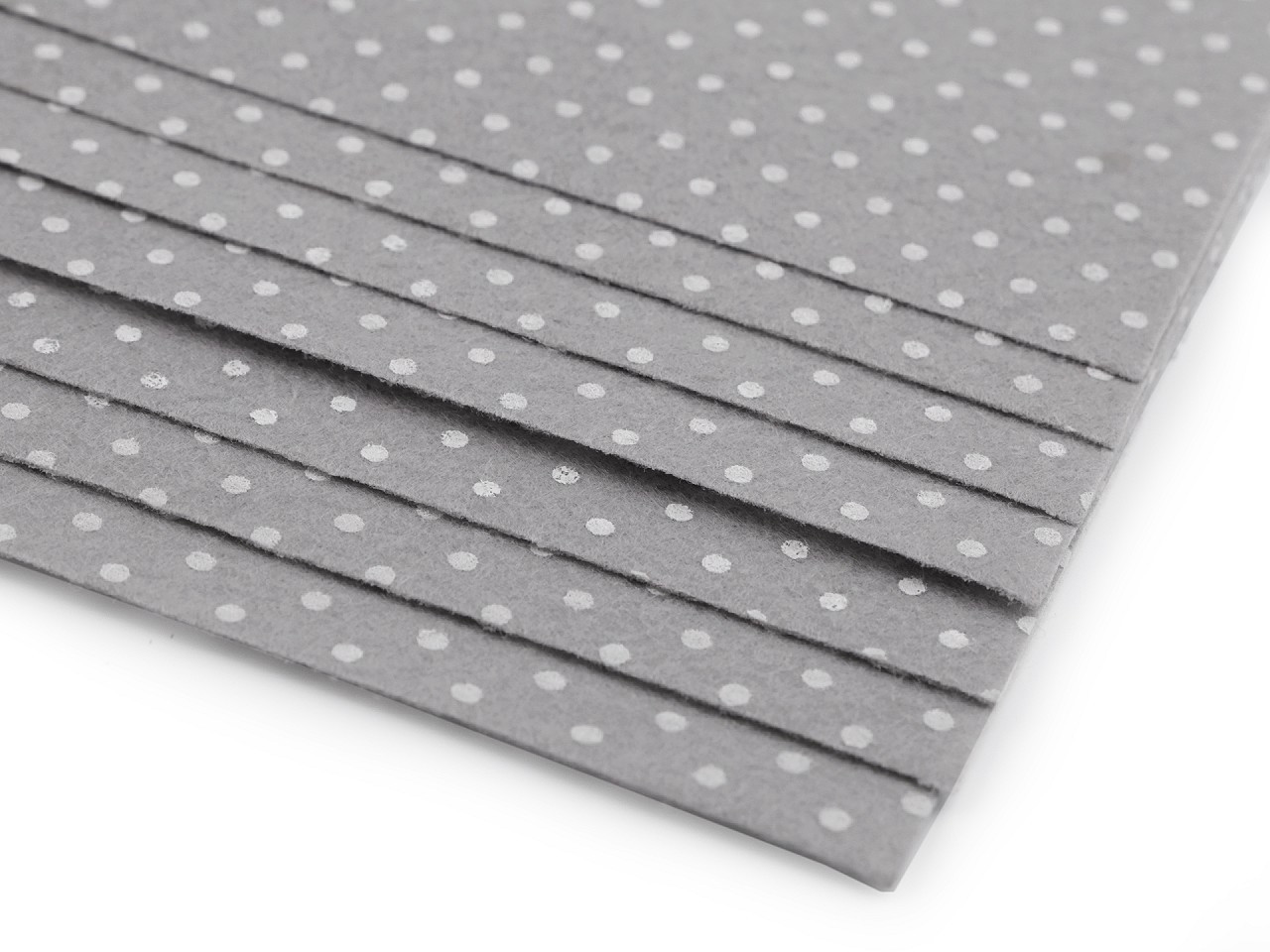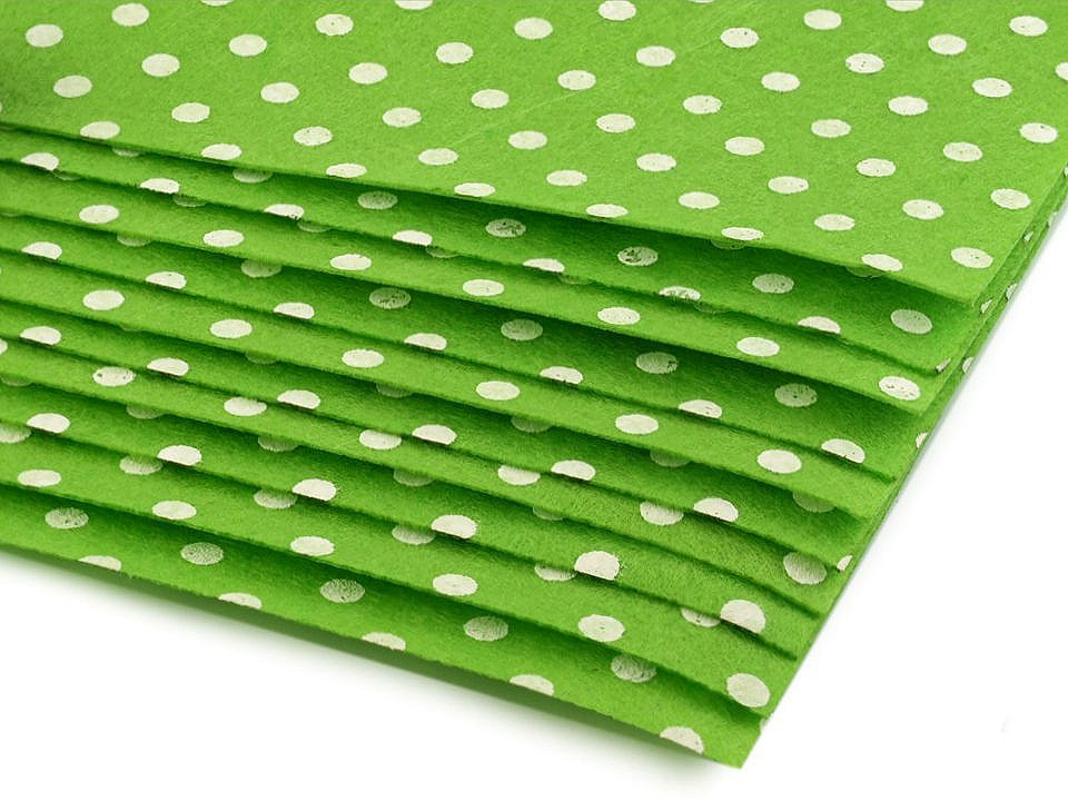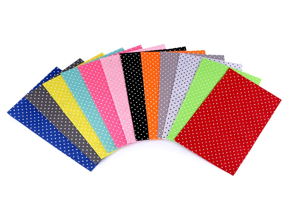 Plsť s potiskem puntíků můžete využít ke zdobení květináčů, k výrobě broží, postaviček, prstových maňásků apod. Nebo si z ní ušijte příjemný a jedinečný obal na vaši oblíbenou knihu. Dá se stříhat, ozdobně prošívat nebo lepit.