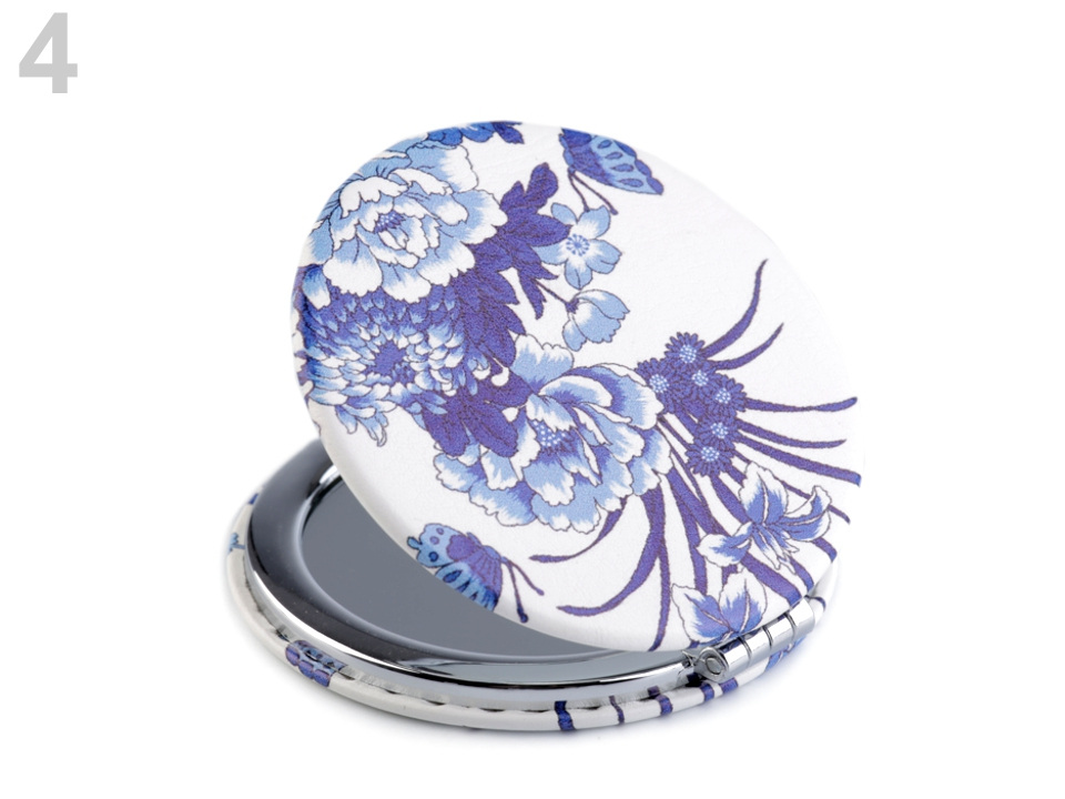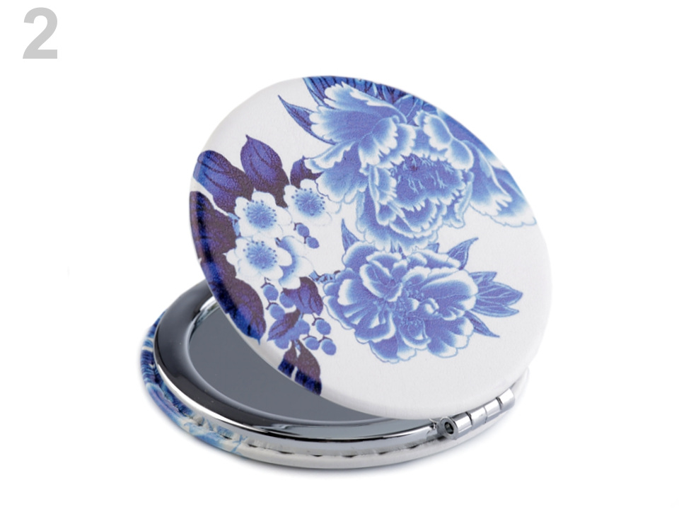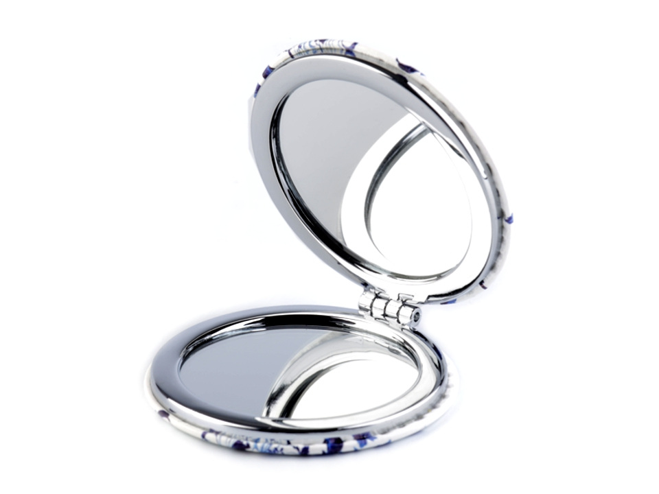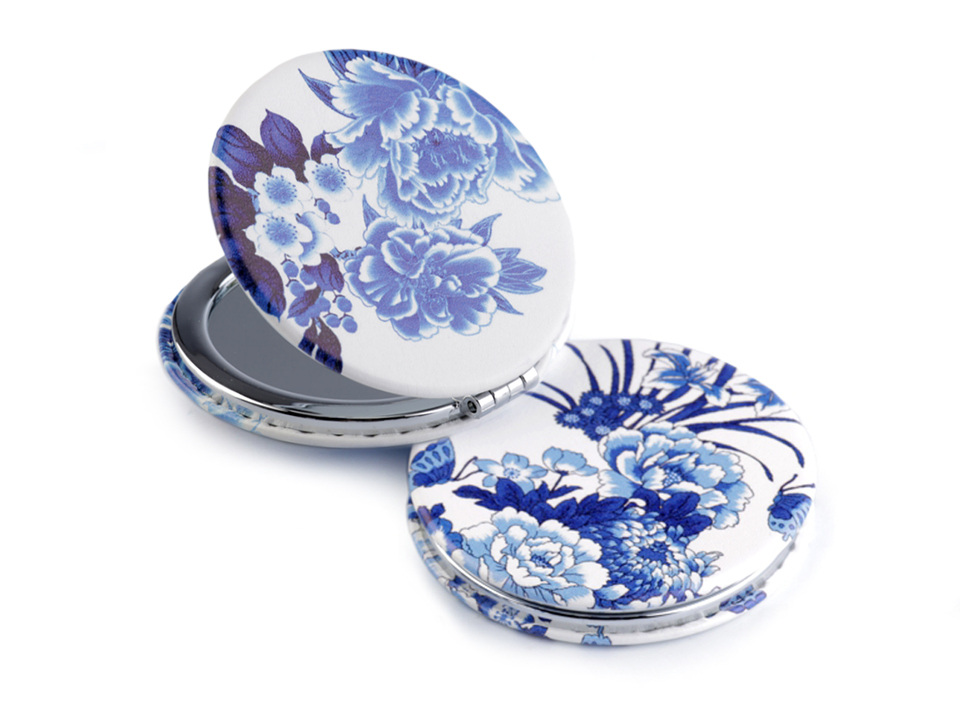 Pouzdro je rozevírací, ukrývá jedno zrcátko klasické, druhé zvětšovací. Vyniká kvalitním kovovým zpracováním. Potah z eko kůže je ozdobený potiskem s kouzelnými motivy modrých květů ve stylu vintage.
