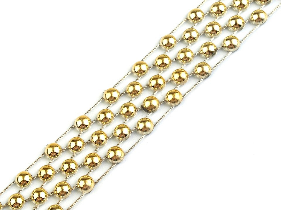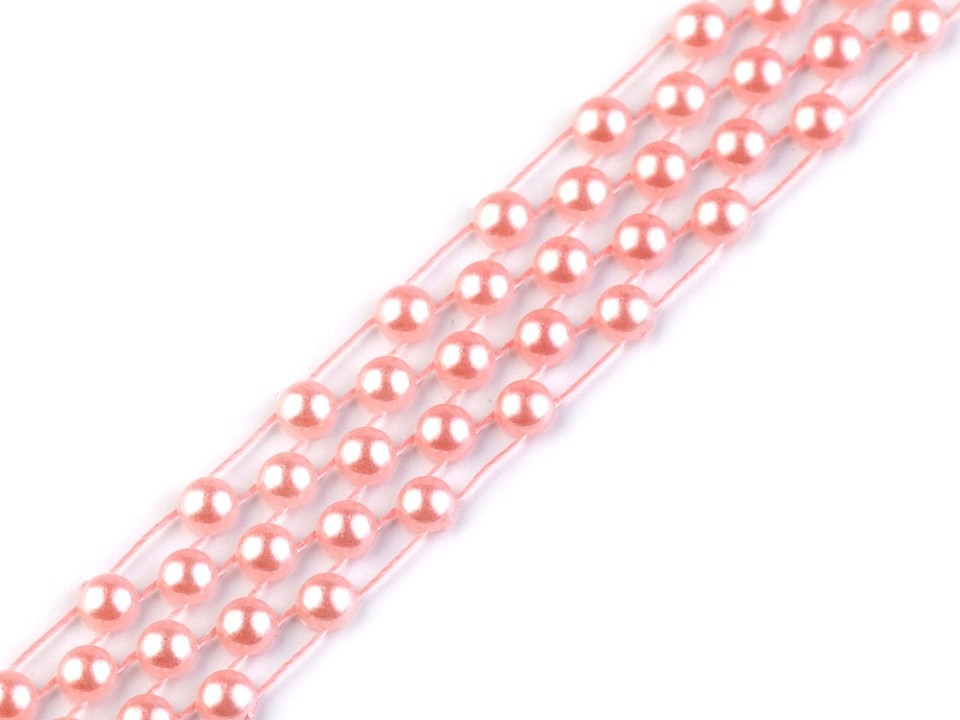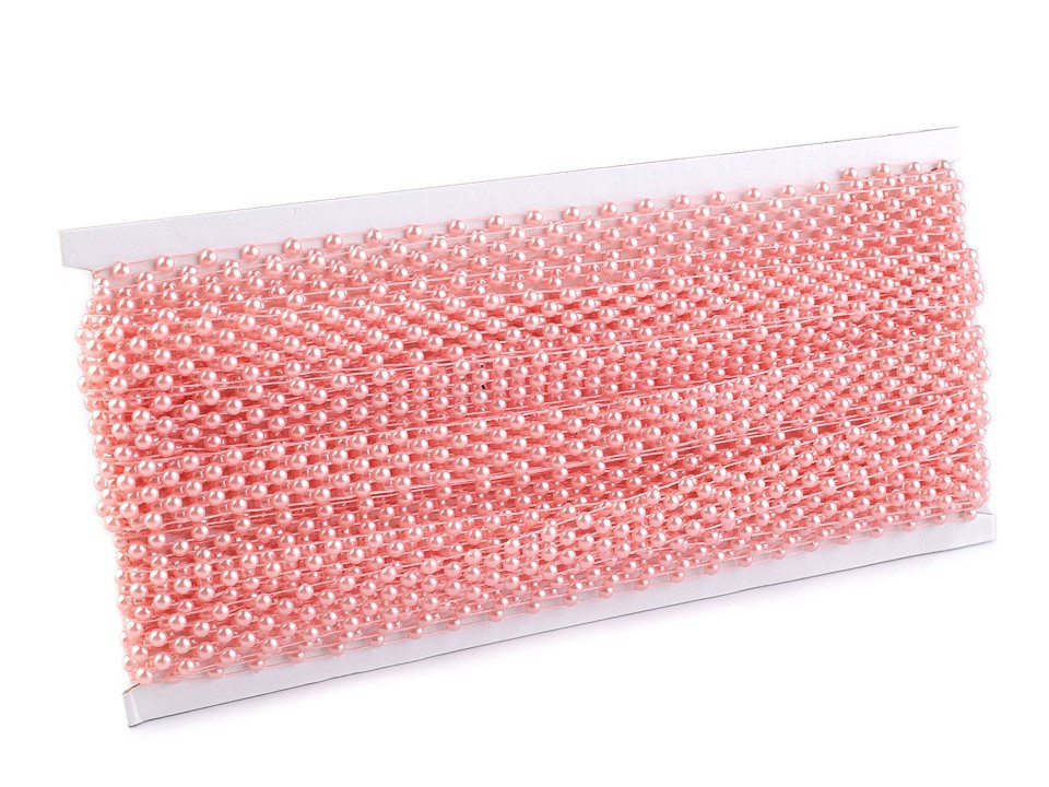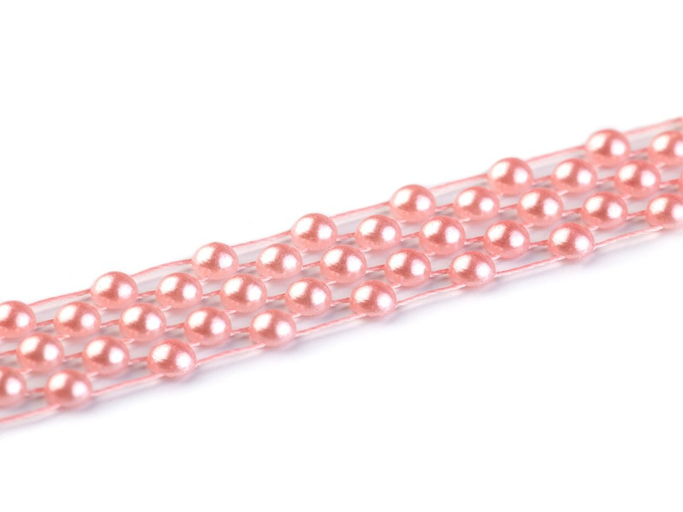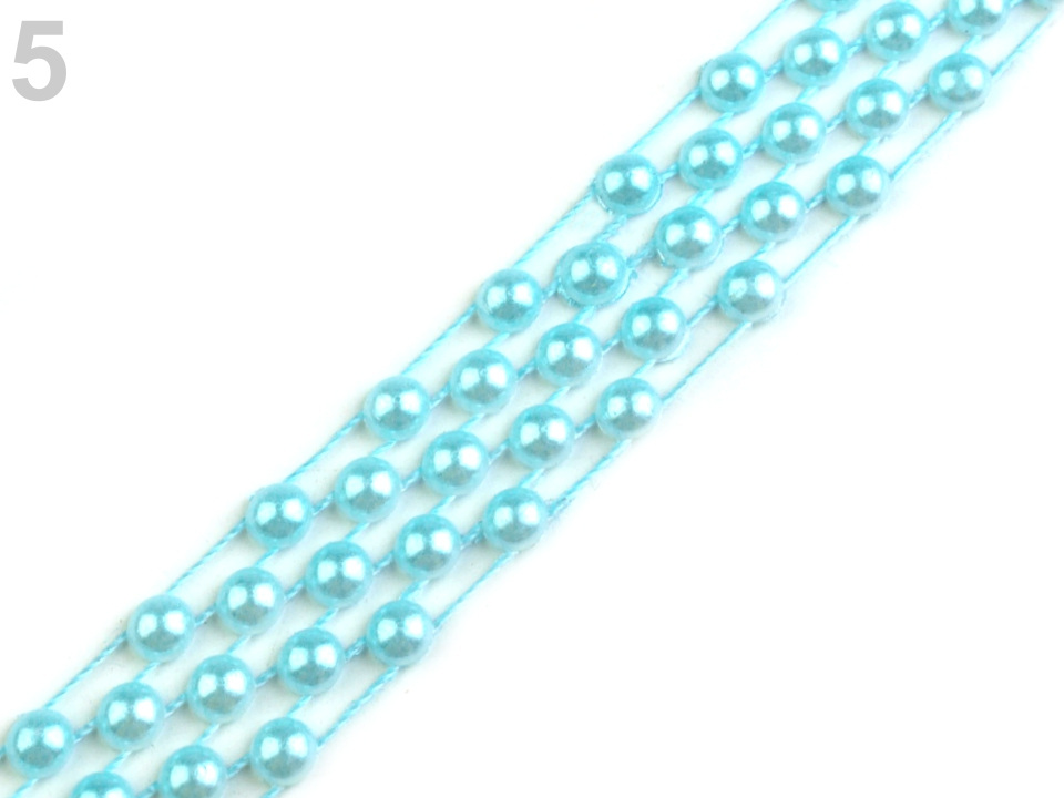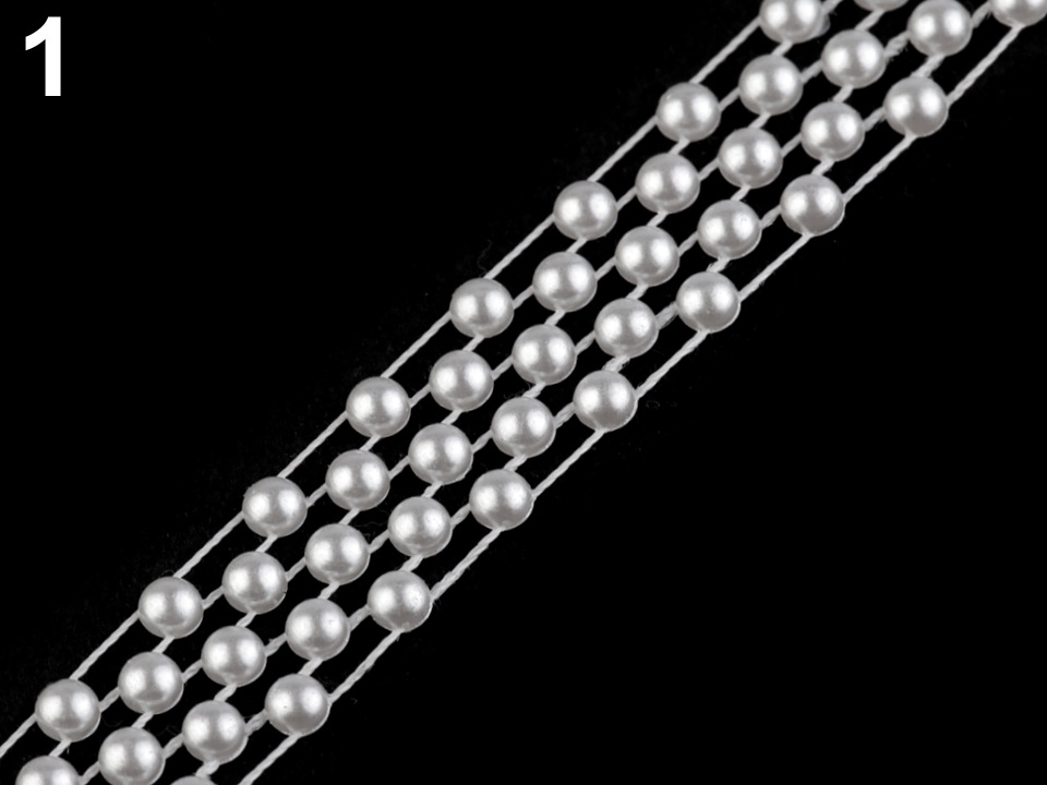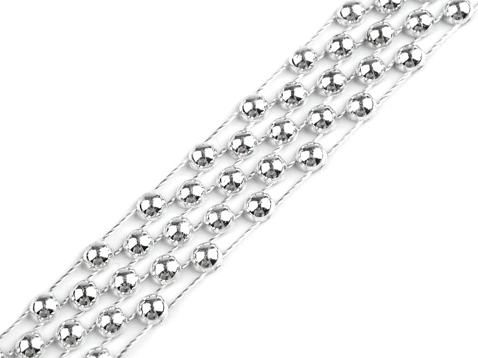 Efektní borta se skládá z plastových perel (Ø4 mm), které mezi sebou tvoří pravidelné rozestupy. Můžete ji stříhat na libovolné kousky a lepit.