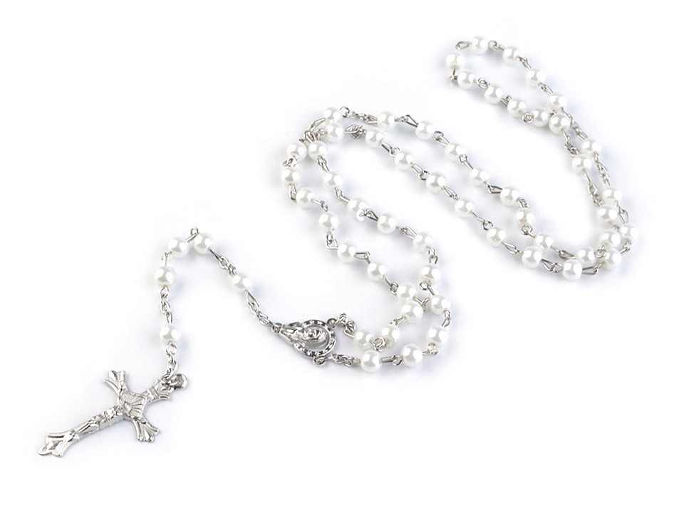 Nabízíme vám ketlovaný růženec se skleněnými korálky. Horní část má rozdělenou na 5 skupin po deseti korálcích. Dole je růženec zakončený kovovým křížkem, který má detailní provedení.