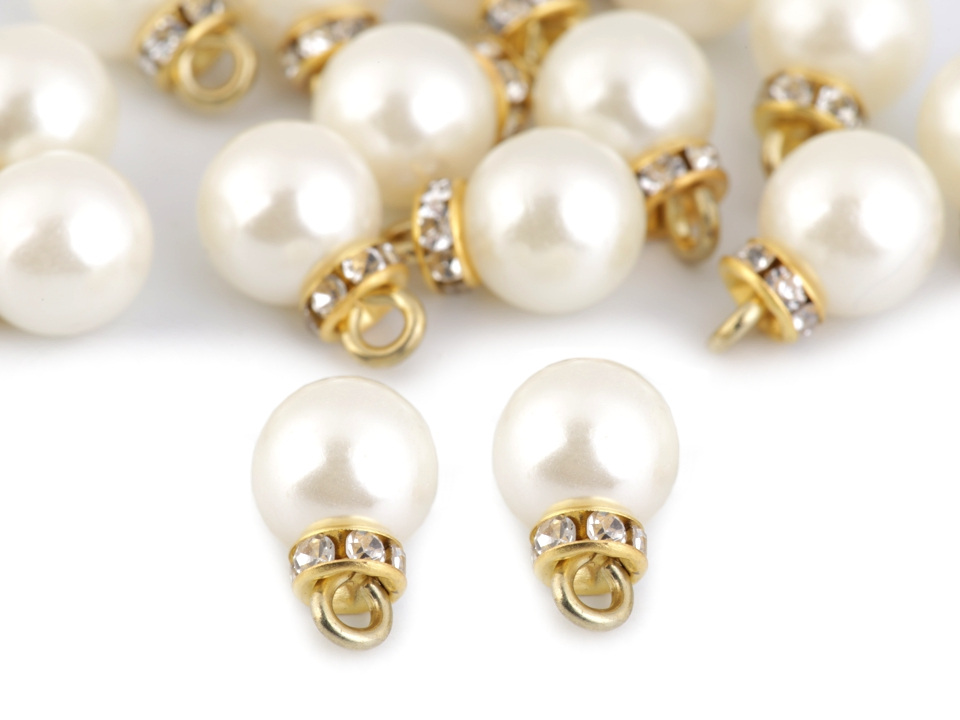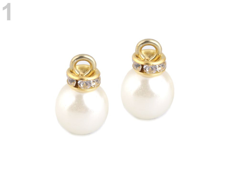 Perla je z plastového korálku s perlovým leskem, rondelka je dokola ozdobená drobnými třpytivými kamínky. Barva kovu je zlatá.