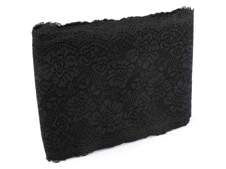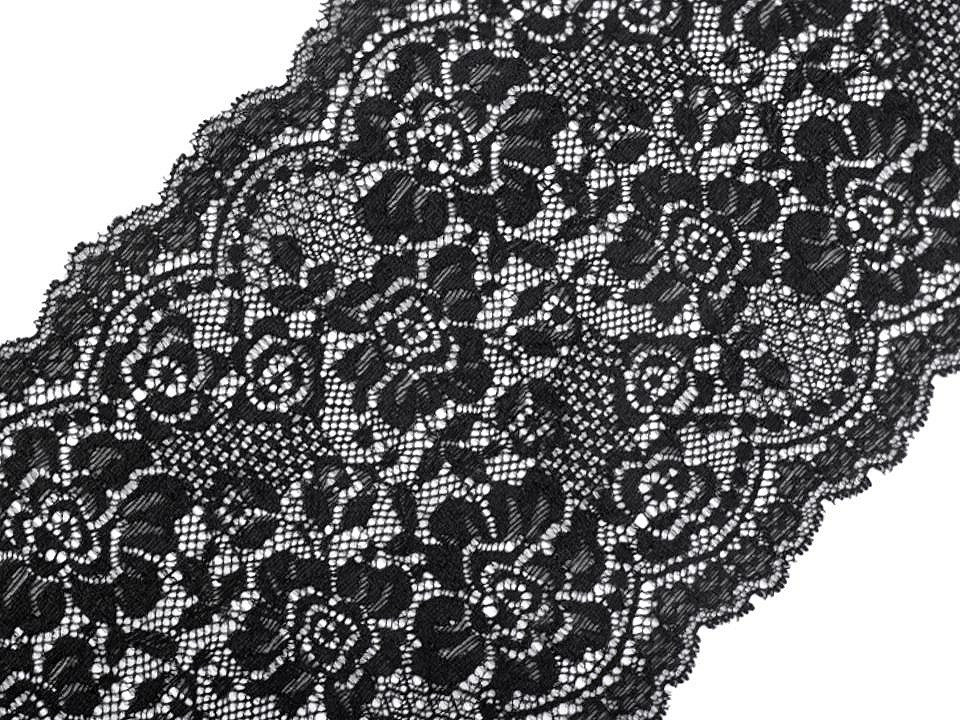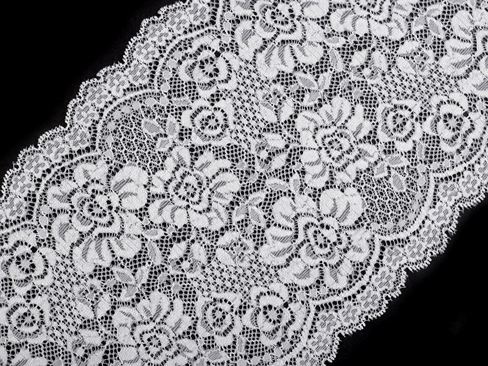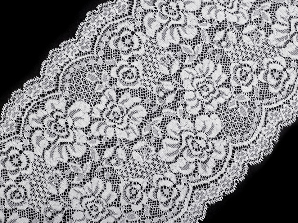Elegantní krajka je pružná. Zdobí ji květinové motivy.