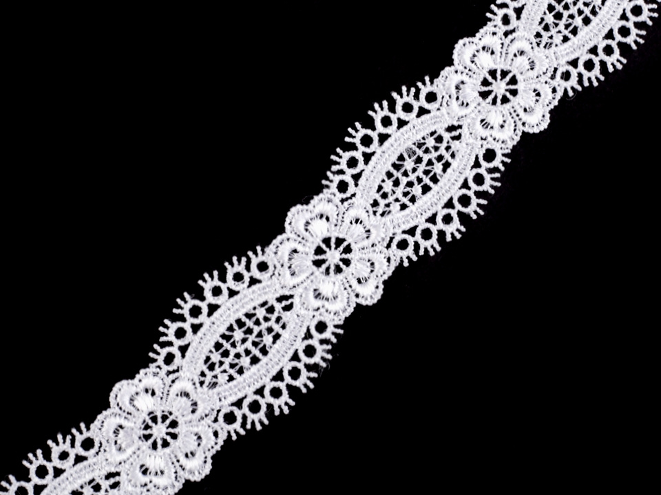 Vzdušná krajka působí romanticky. Zobrazuje velké květy s oblouky, připomínající paví očka.