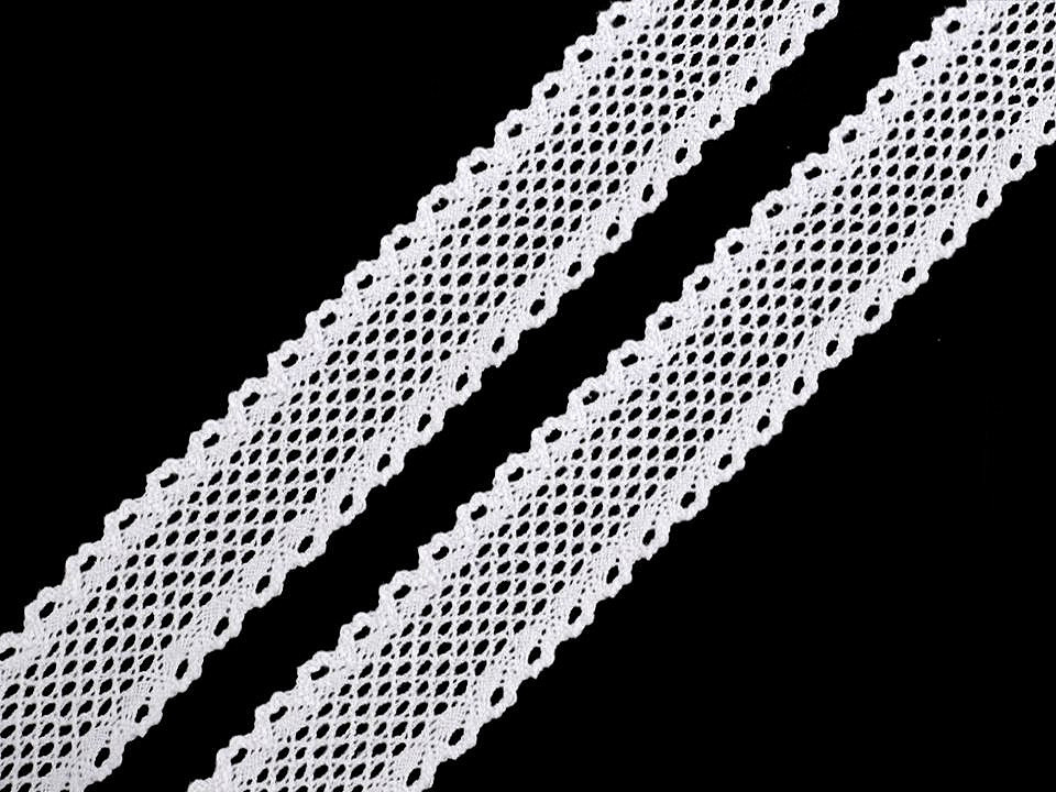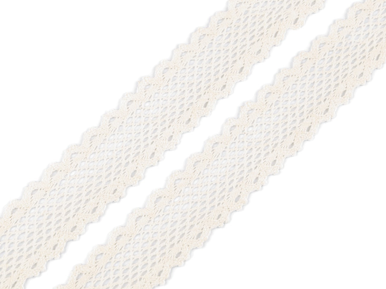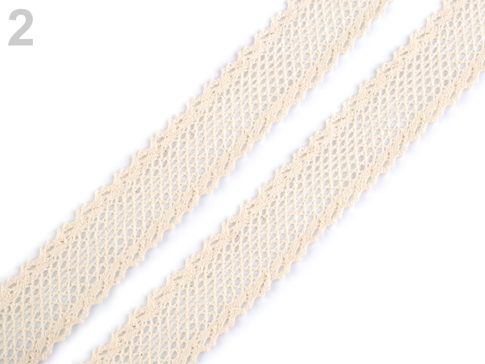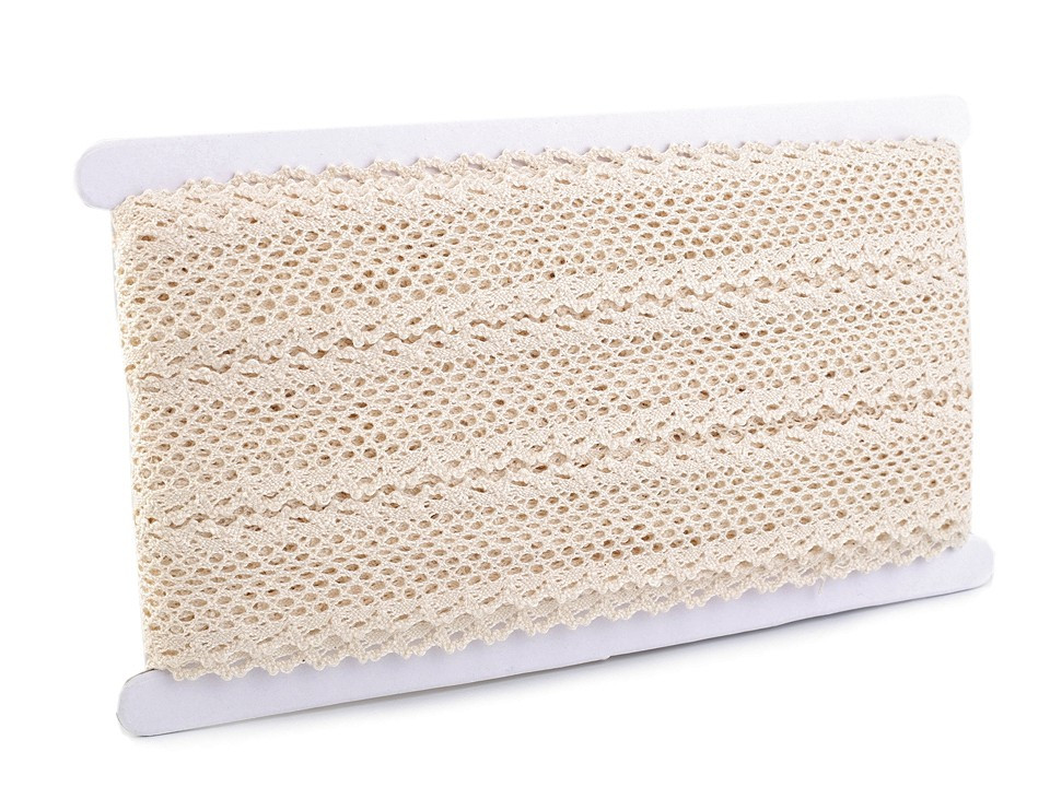 Bavlněná krajka je zajímavá svým originálním paličkovaným vzorem. Uvnitř má vzor síťky, po stranách ji zdobí obloučky.