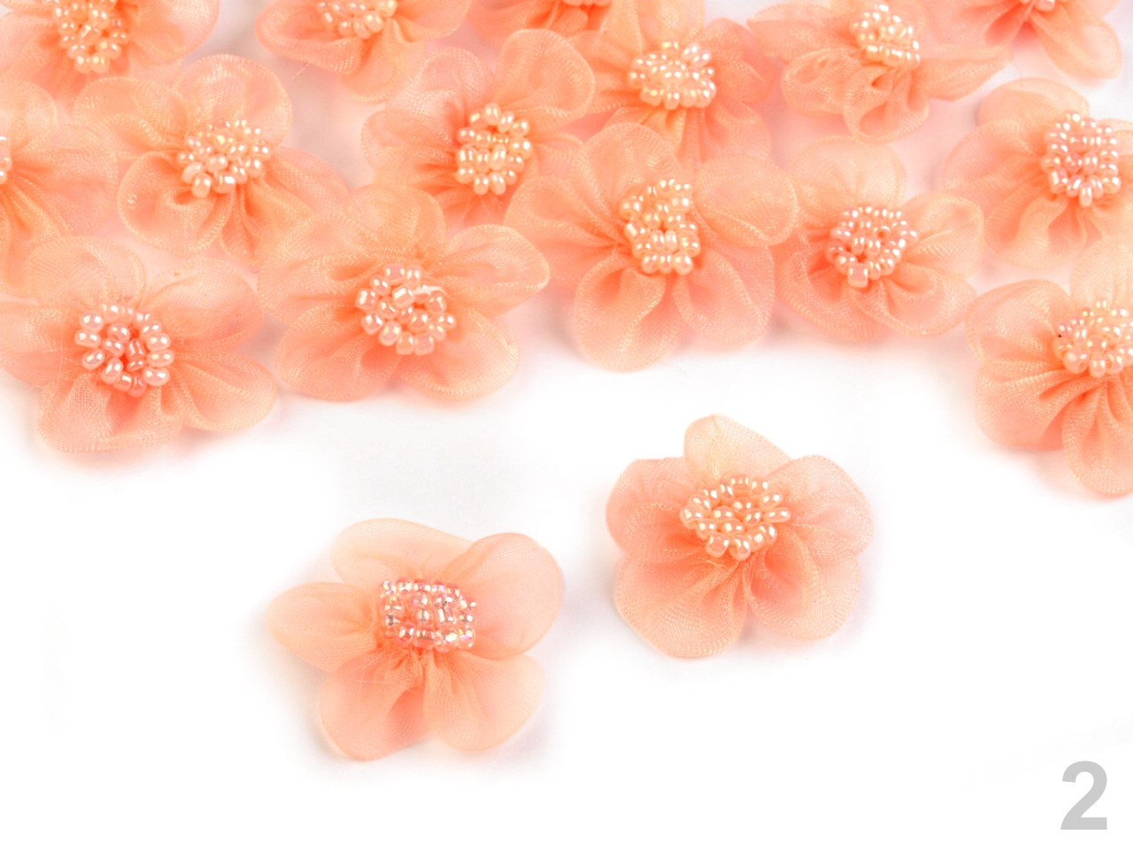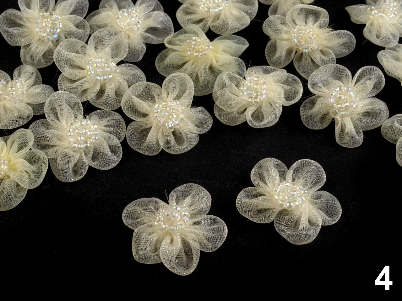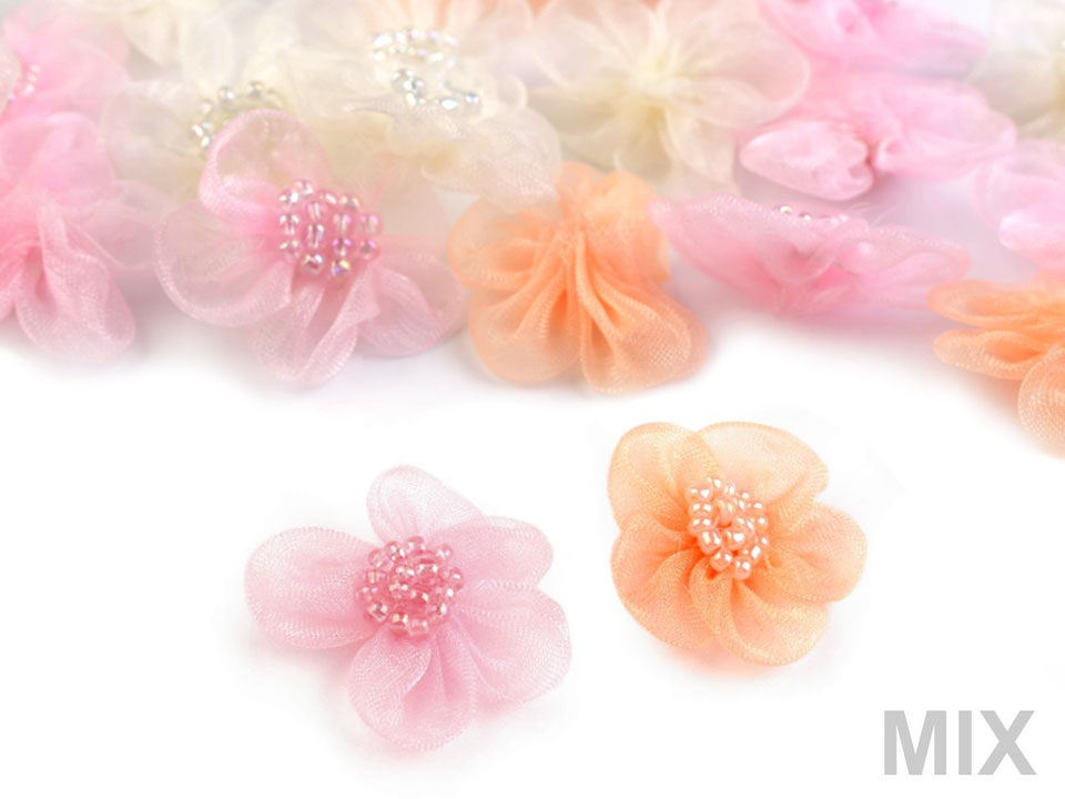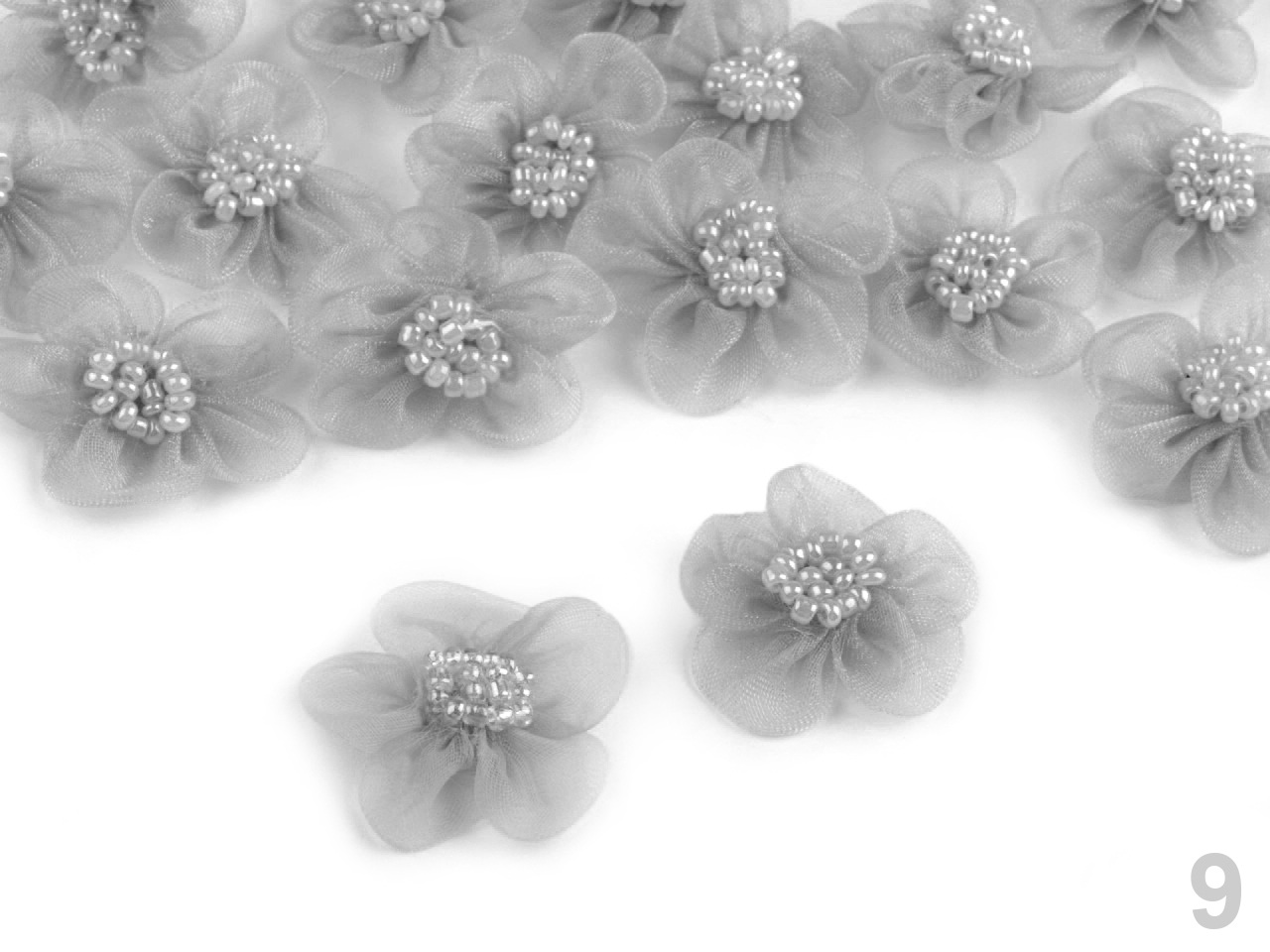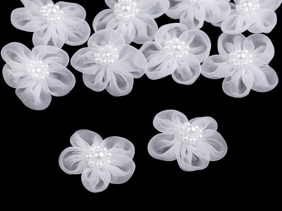 Něžný monofilový květ je velice romantický. V jeho středu jsou našité skleněné perličky s perleťovým leskem.