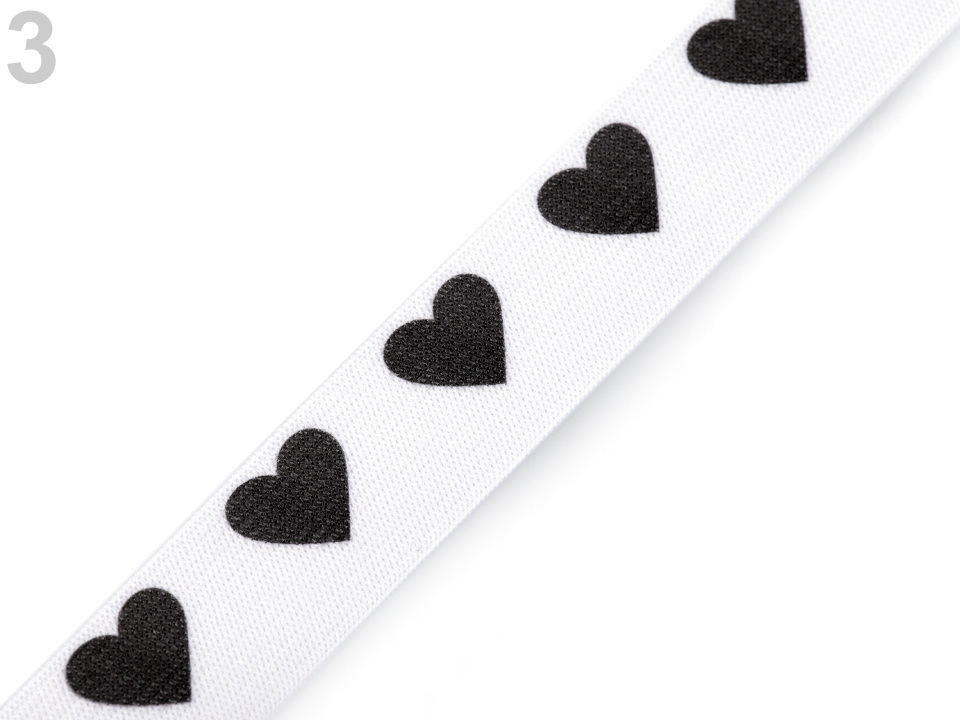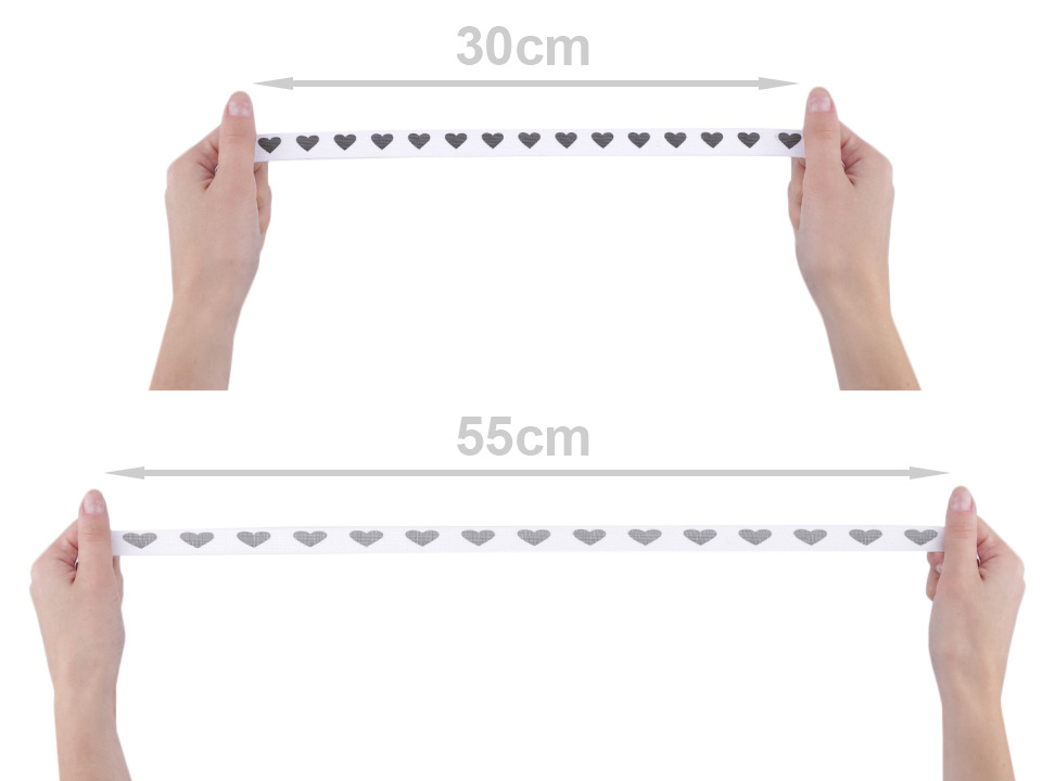 Pruženku zdobí potisk romantických srdíček, který je jednostranný. Je elastická (tažná), po roztažení se vrátí zpět do původního stavu.