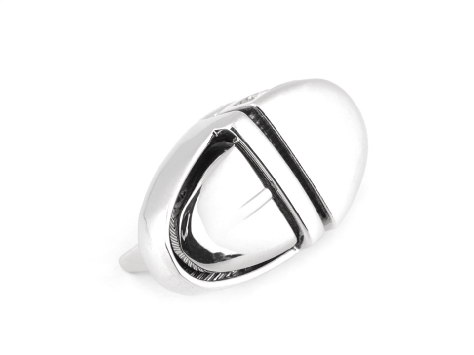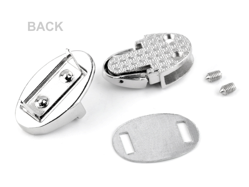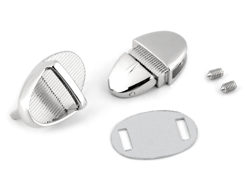 Sada zapínání na kabelku či tašku se skládá ze tří dílů. Jeden díl se připevní na vnitřní část kabelky, druhý (s nožkami) na vnější část kabelky a třetí díl pomocí šroubků na chlopeň kabelky. Pokud zasunete s cvaknutím jednotlivé díly do sebe, máte bezpečně uzavřenou tašku.