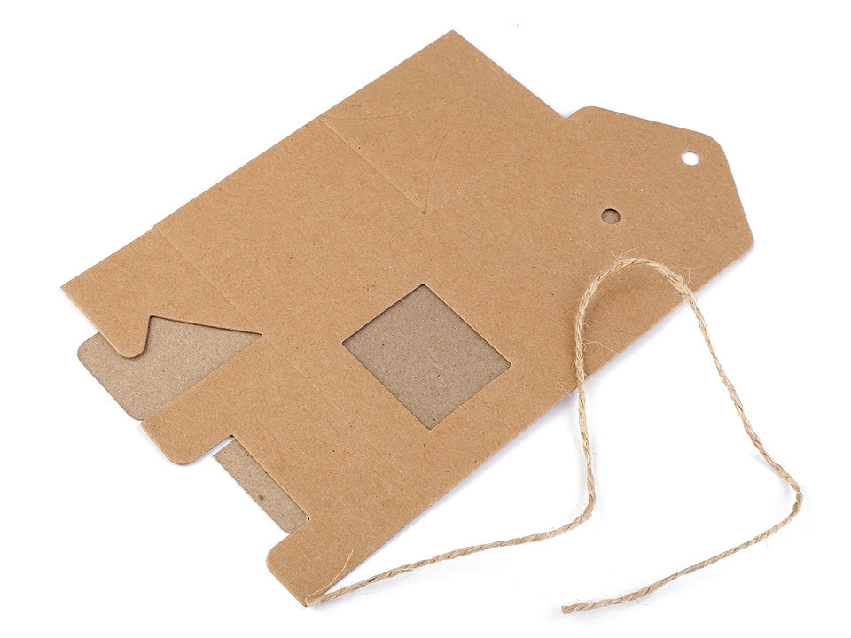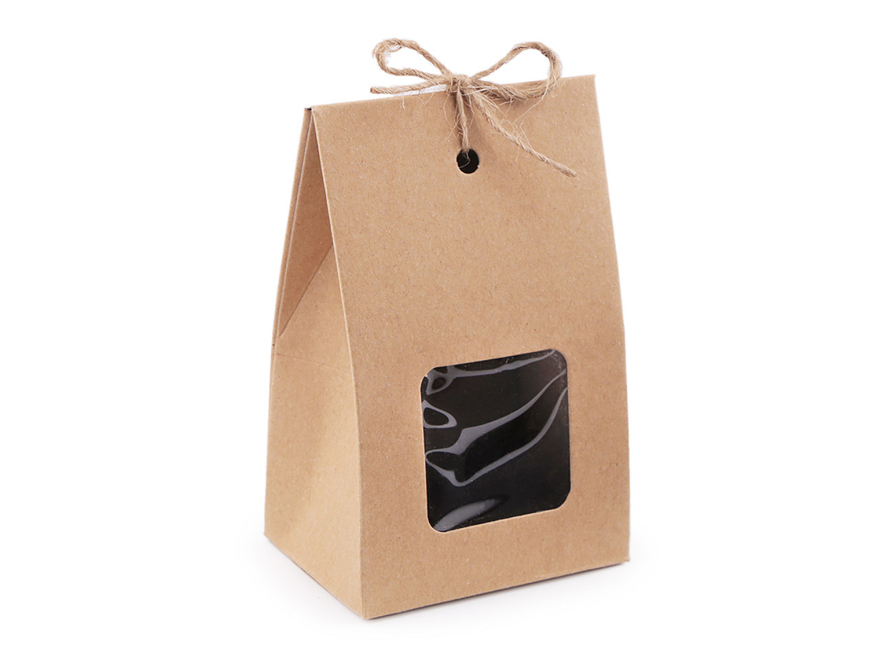 Papírová krabička má na přední straně plastový průhled. Krabičku zavřete pomocí provázku z juty, který dodává punc přírodnímu vzhledu. Využijete ji na zabalení menších dárků, například kosmetiky, svíček, apod. Pokud jste kreativní, můžete krabičku dozdobit flitry, glitry, krajkou, samolepícími ozdobami apod.
