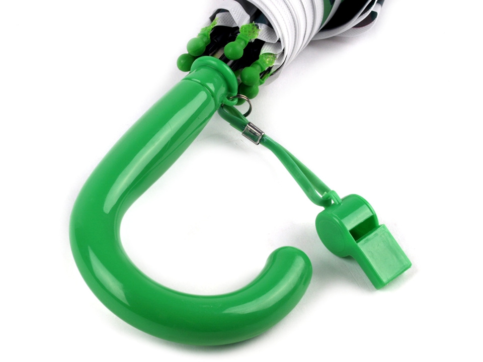Píšťalka je plastová. Je připevněná poutkem k rukojeti deštníku.