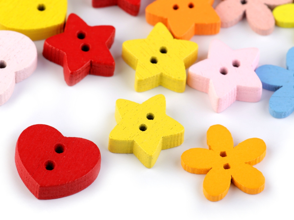 Dřevěné knoflíky ve tvaru srdce, hvězdy nebo květu využijete převážně ve scrapbookingu. Můžete s nimi ozdobit rámečky, přáníčka, jmenovky, pozvánky, deníky apod. Lze je použít i do květinových vazeb, které se tím krásně oživí.