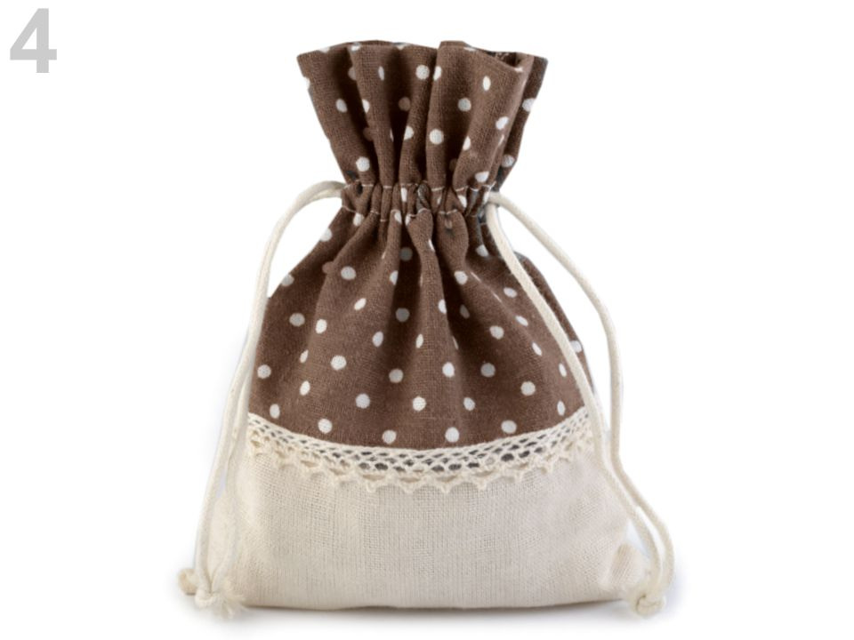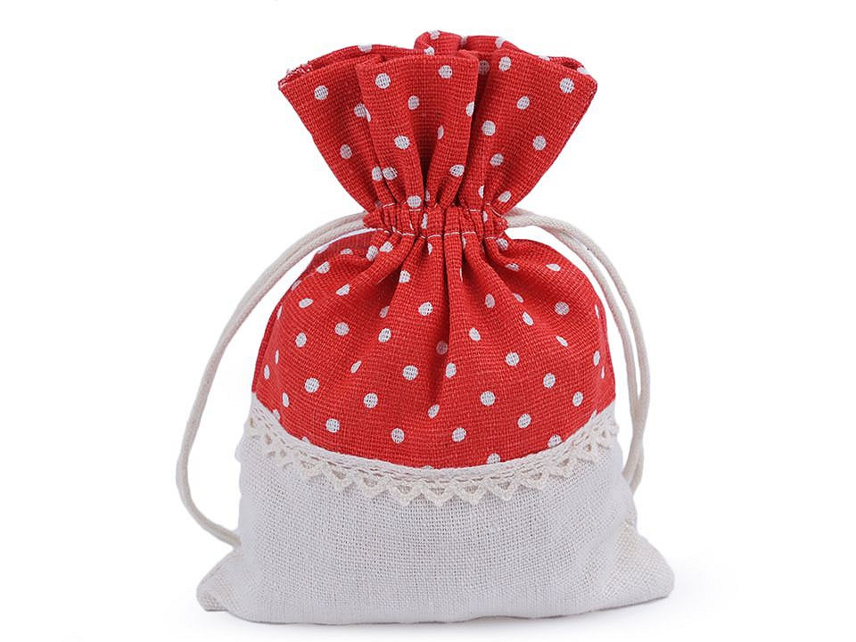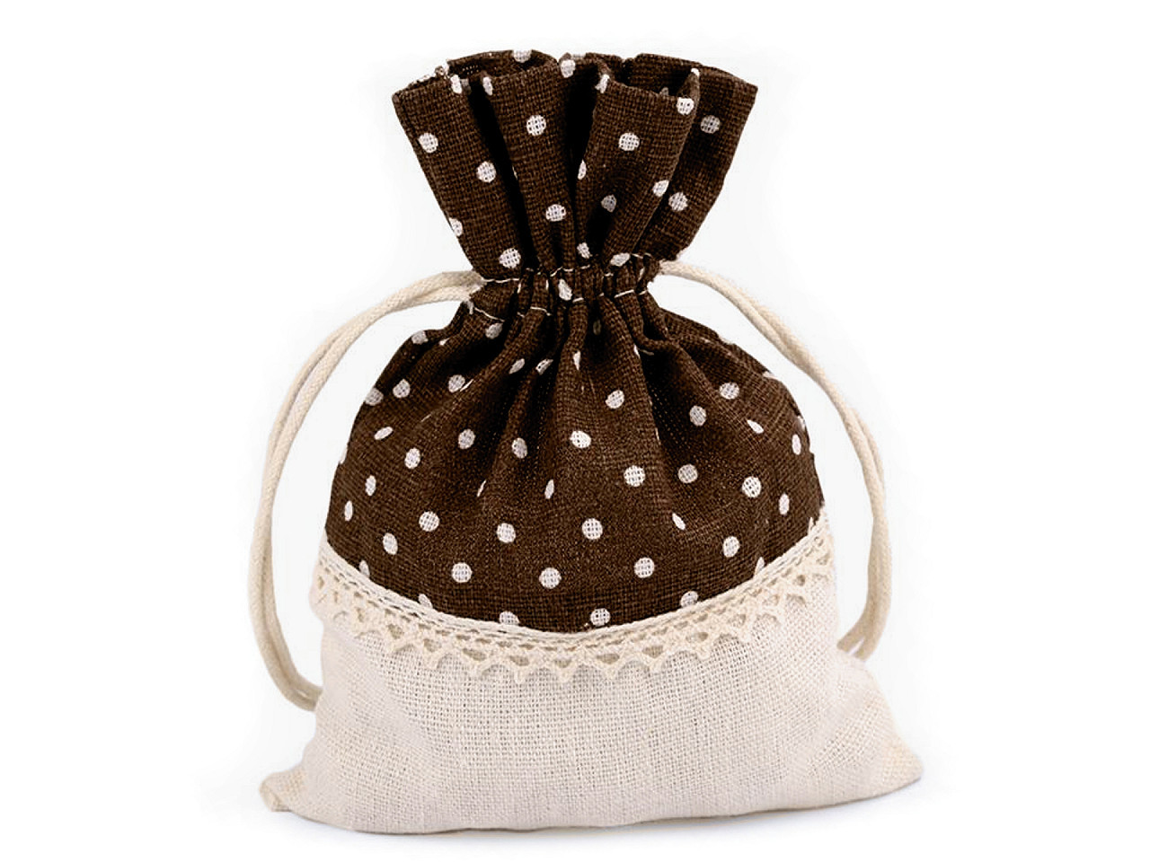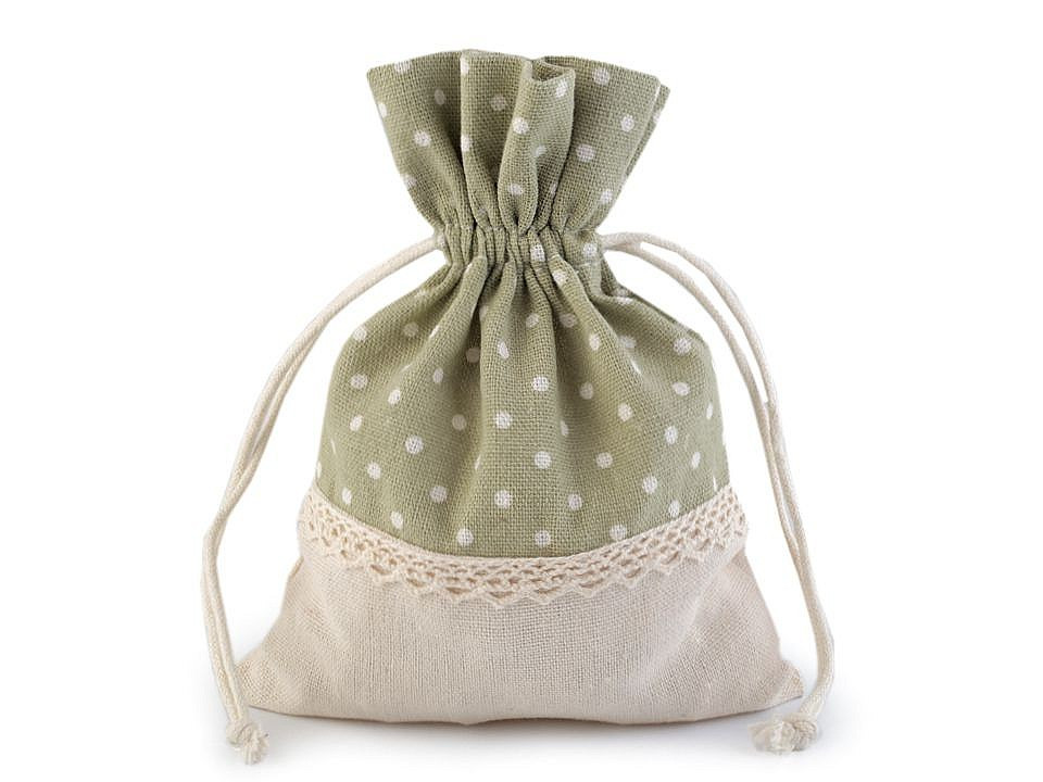 Lněný pytlík s puntíky a krajkou působí roztomile a zároveň romanticky. Puntíky zdobí jednu polovinu pytlíku a díky krajce elegantně přecházejí v klasický lněný pytlík. Uzavírá se pomocí dvou stahovacích šňůrek.
