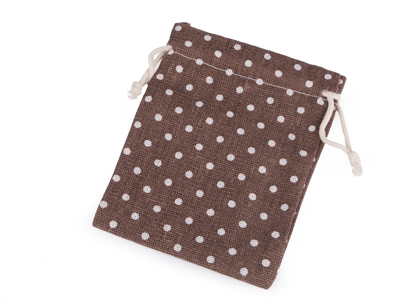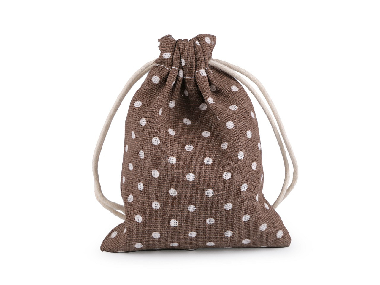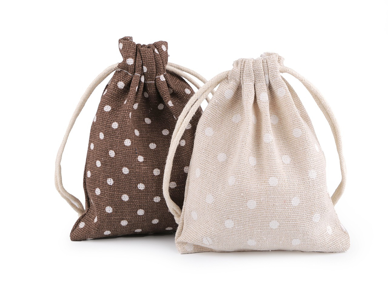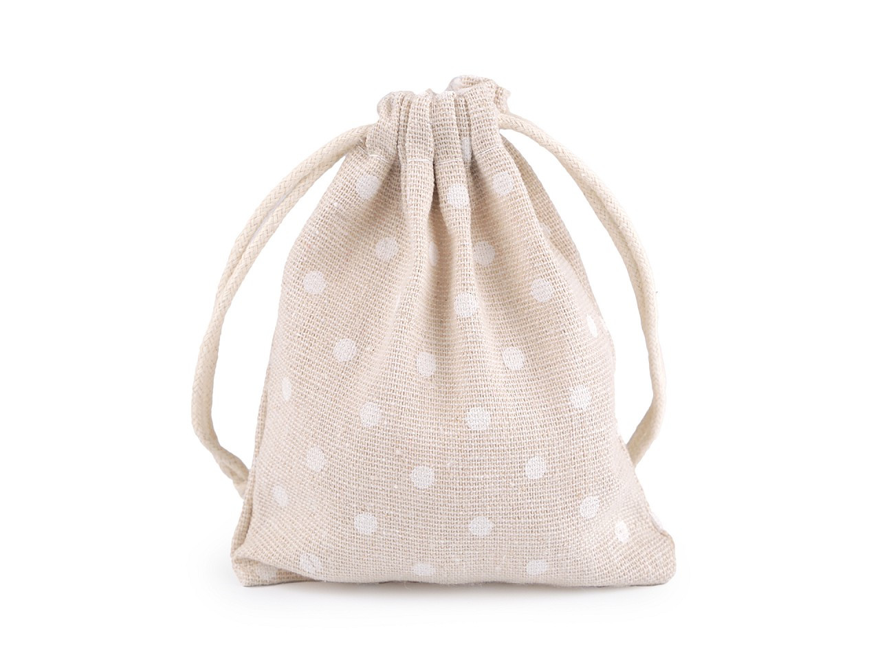 Pytlík je vyrobený z kvalitního a pevného materiálu. Snadno se uzavírá pomocí dvou bavlněných stahovacích šňůrek. Má veselý puntíkovaný design.