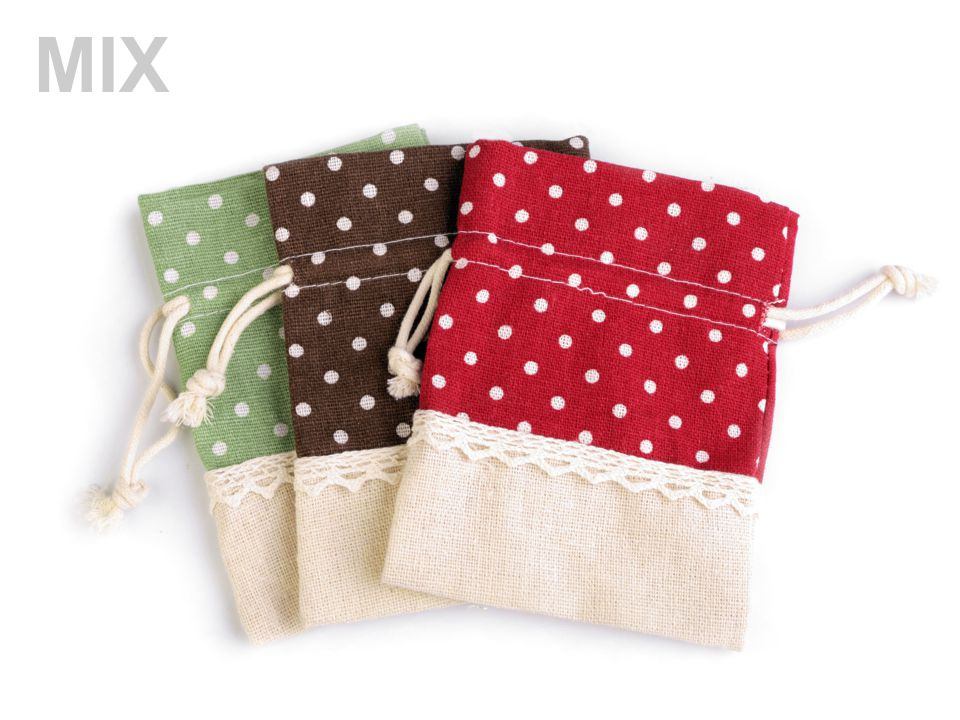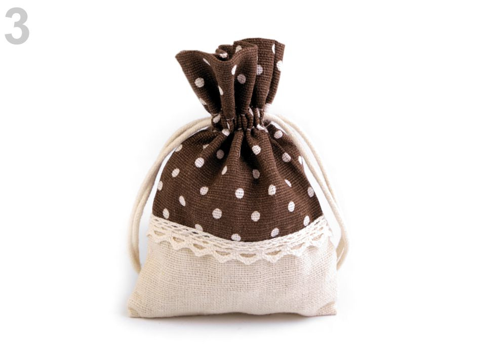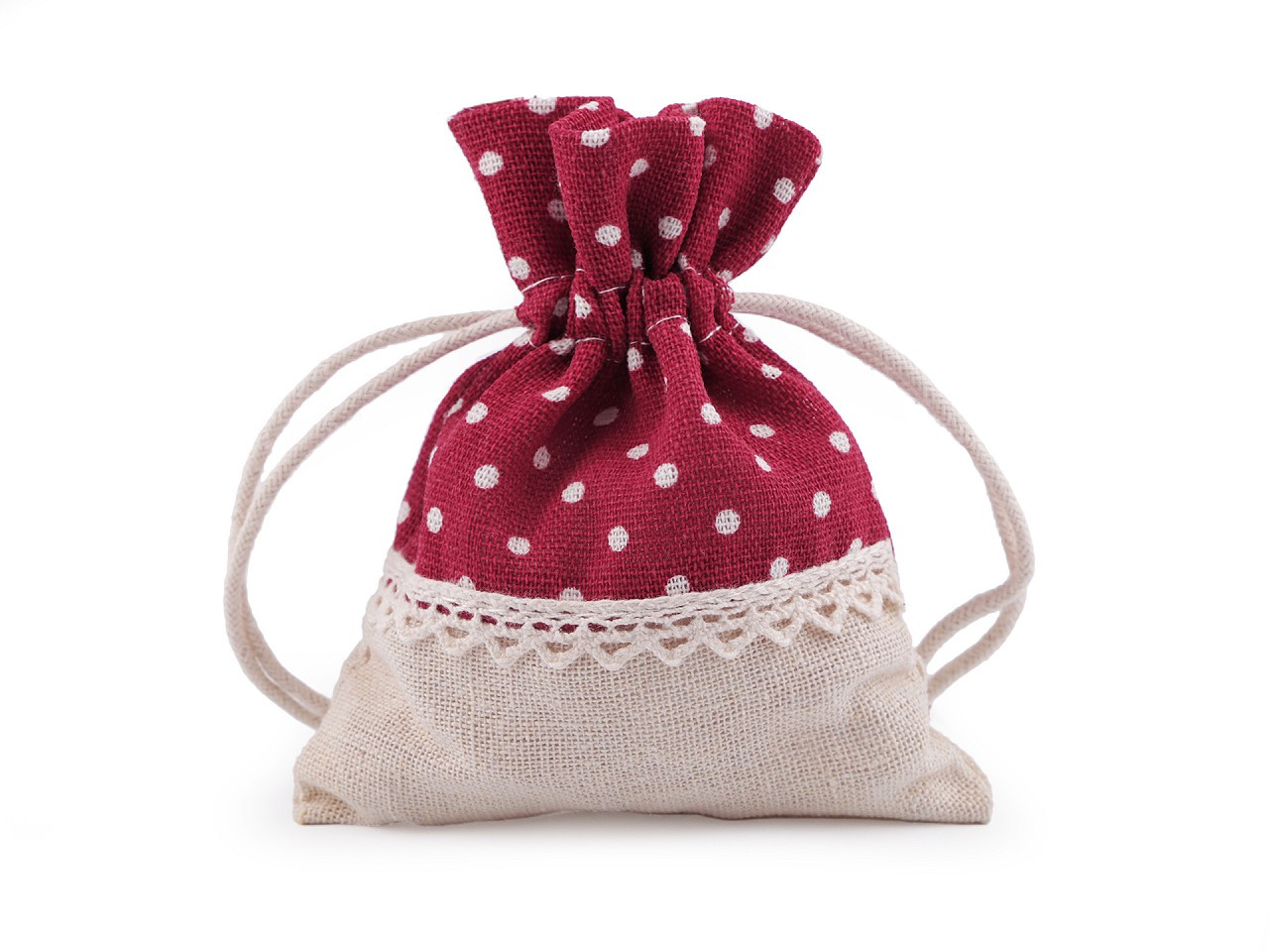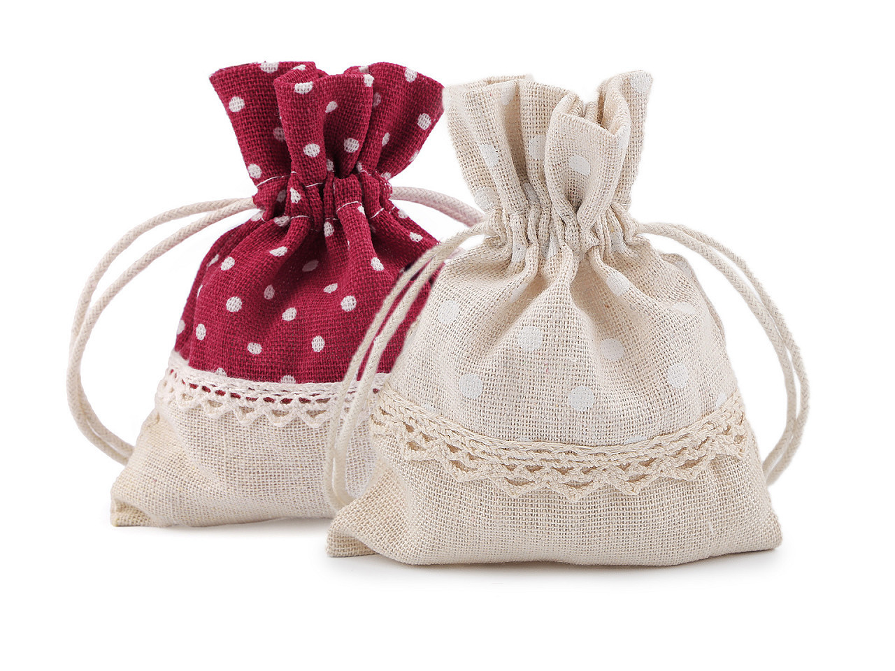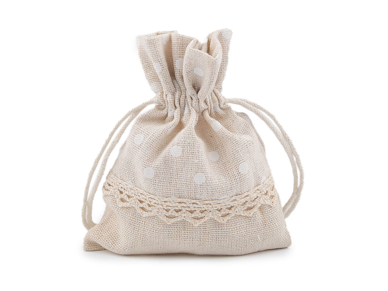 Lněný pytlík s puntíky a krajkou působí roztomile a zároveň romanticky. Puntíky zdobí jednu polovinu pytlíku a díky krajce elegantně přecházejí v klasický lněný pytlík. Uzavírá se pomocí dvou stahovacích šňůrek.