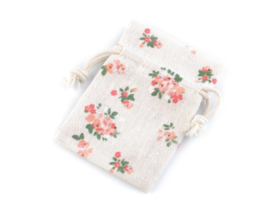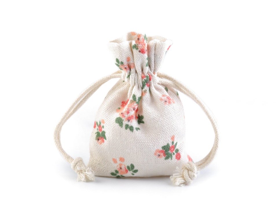 Bavlněný pytlík zdobí potisk drobných květů. Snadno se uzavírá pomocí dvou stahovacích šňůrek.
