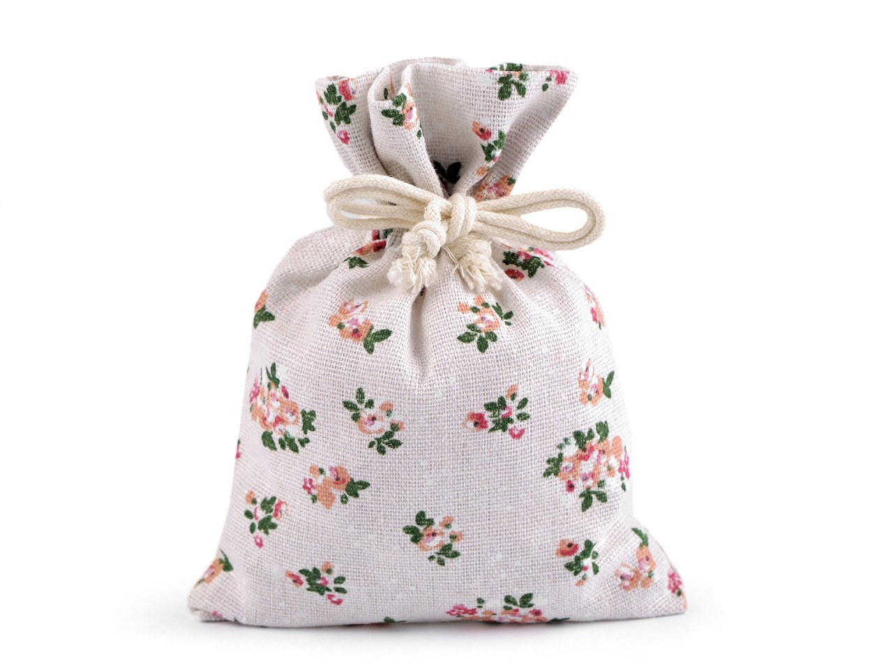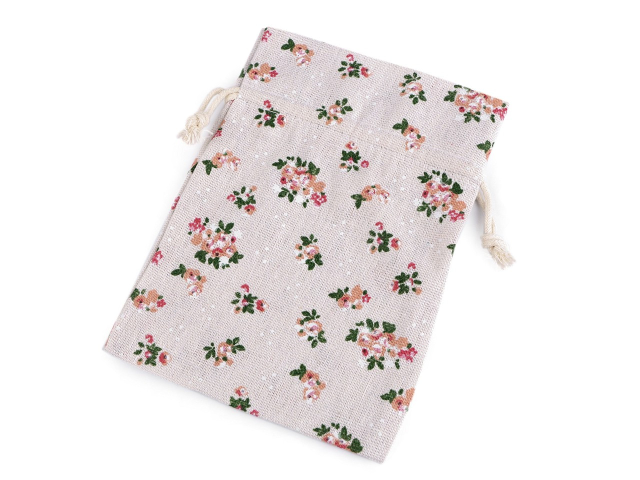 Bavlněný pytlík zdobí potisk drobných květů. Snadno se uzavírá pomocí dvou stahovacích šňůrek.