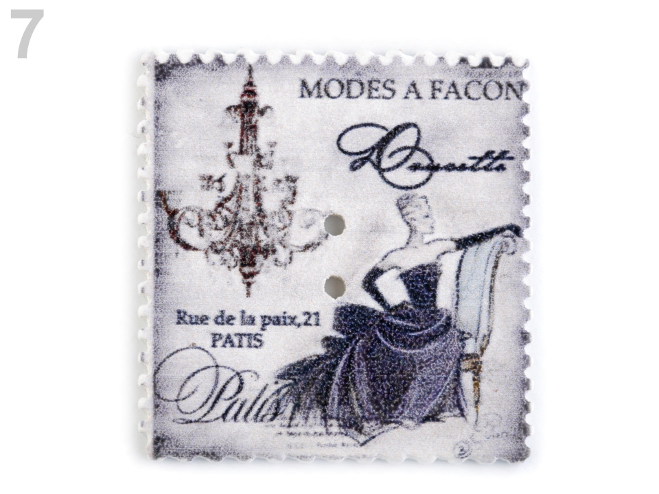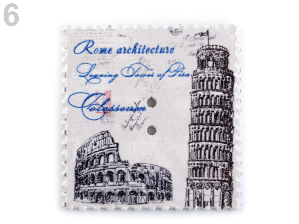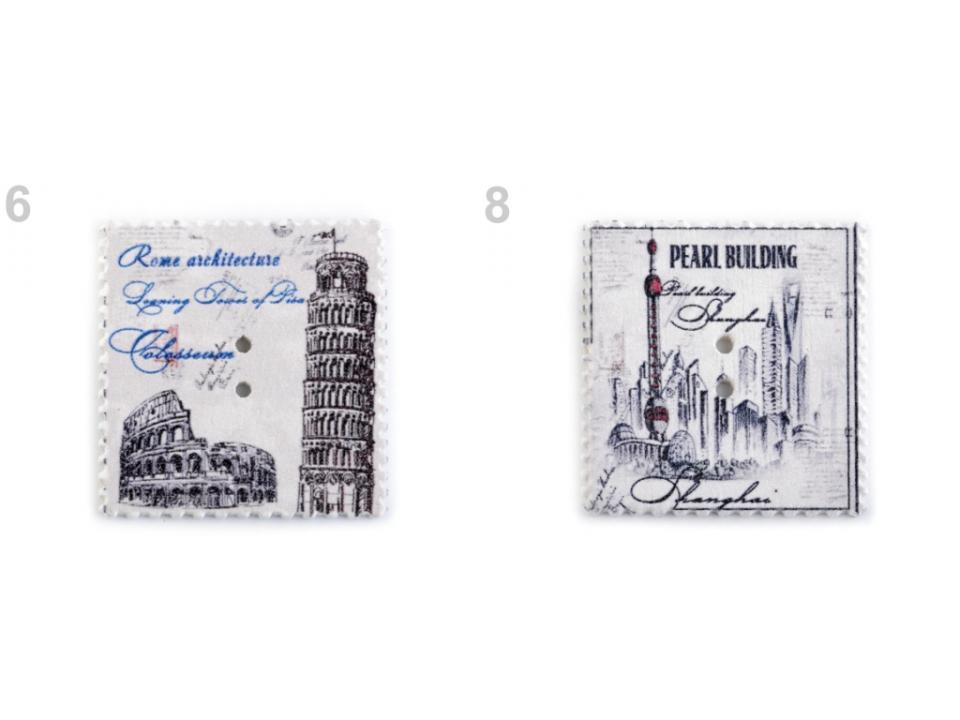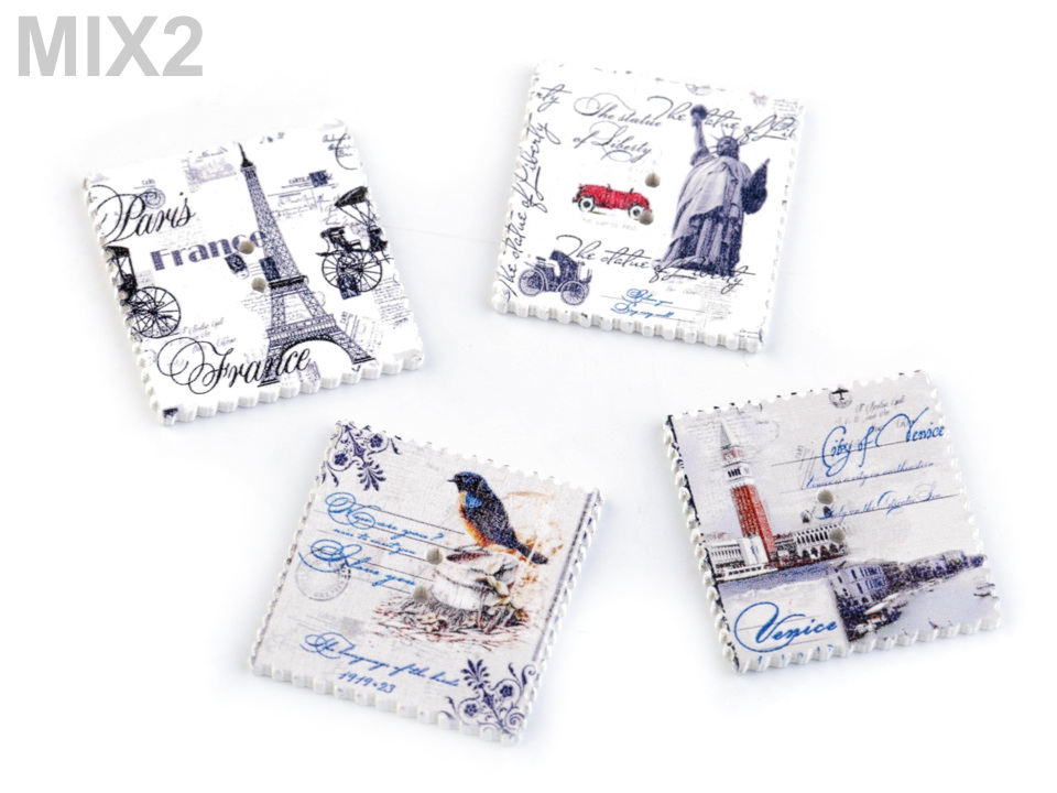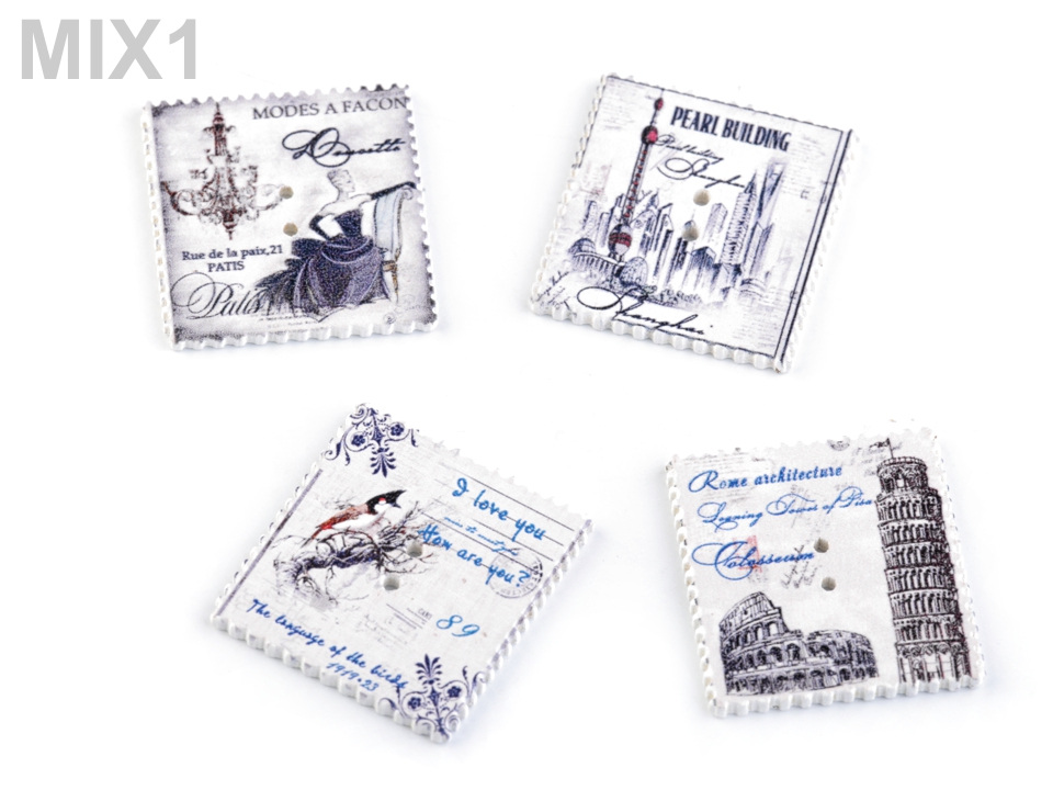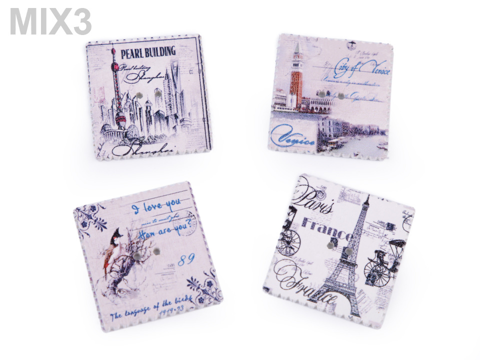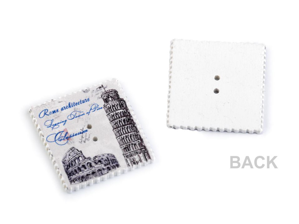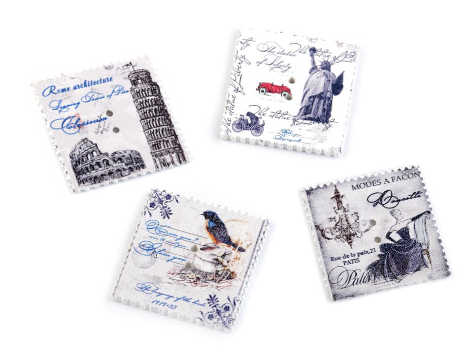 Máte rádi vintage styl? Pokud ano, tyto dřevěné knoflíky se vám budou určitě hodit "do sbírky". Naleznete na nich symboly známých měst nebo přírodu. Okraje jsou dekorovány obloučky. Využijete je převážně ve scrapbookingu. Můžete s nimi ozdobit foto rámečky, alba, deníky, přáníčka a pozvánky. Motiv je jednostranný, z druhé strany jsou knoflíky bílé.