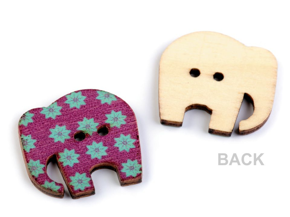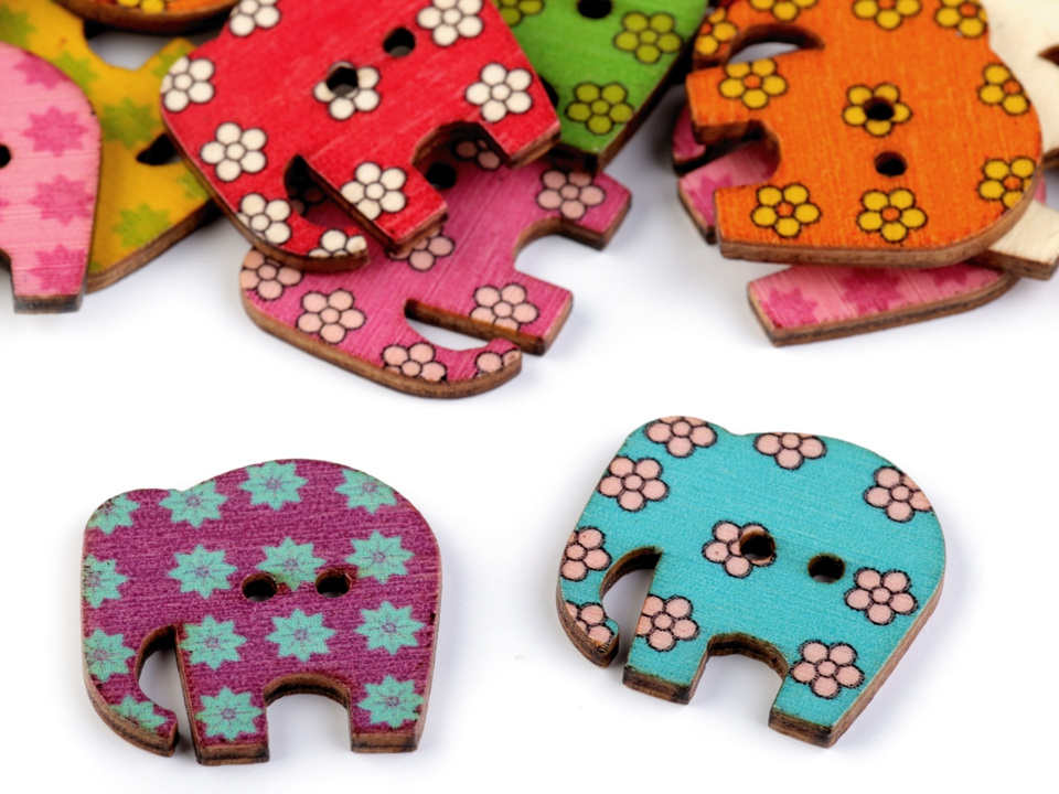 Dřevěné dekorační knoflíky ve tvaru slona jsou navíc ozdobeny květy. Využijete je hlavně v technice scrapbooking. Můžete s nimi ozdobit rámečky, přáníčka, jmenovky, pozvánky, deníky apod. Lze je použít i do květinových vazeb, které se tím krásně oživí.