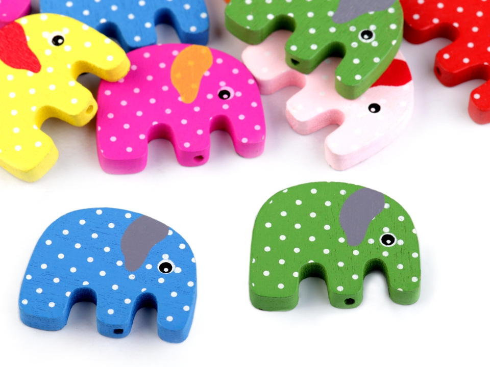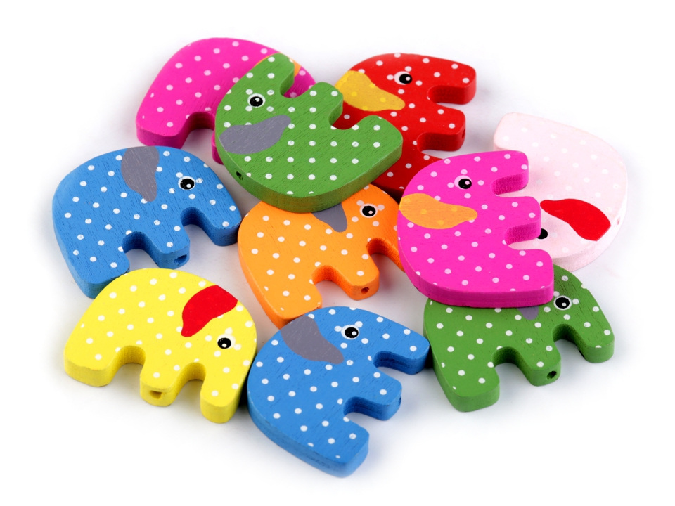 Dřevěné barevné korálky slonů oživí jakýkoliv dětský náhrdelník či náramek. Můžete je navlékat na silon nebo tenkou voskovanou šňůrku s dalšími korálky. Šňůrku můžete zdobit i uzlíky, sami budete nadšeni z originálního náhrdelníku, který vám vznikne. Slona můžete použít i jako samostatný přívěsek. Jeho velikost je vhodná i na přívěsek ke klíčům, kabelce apod.