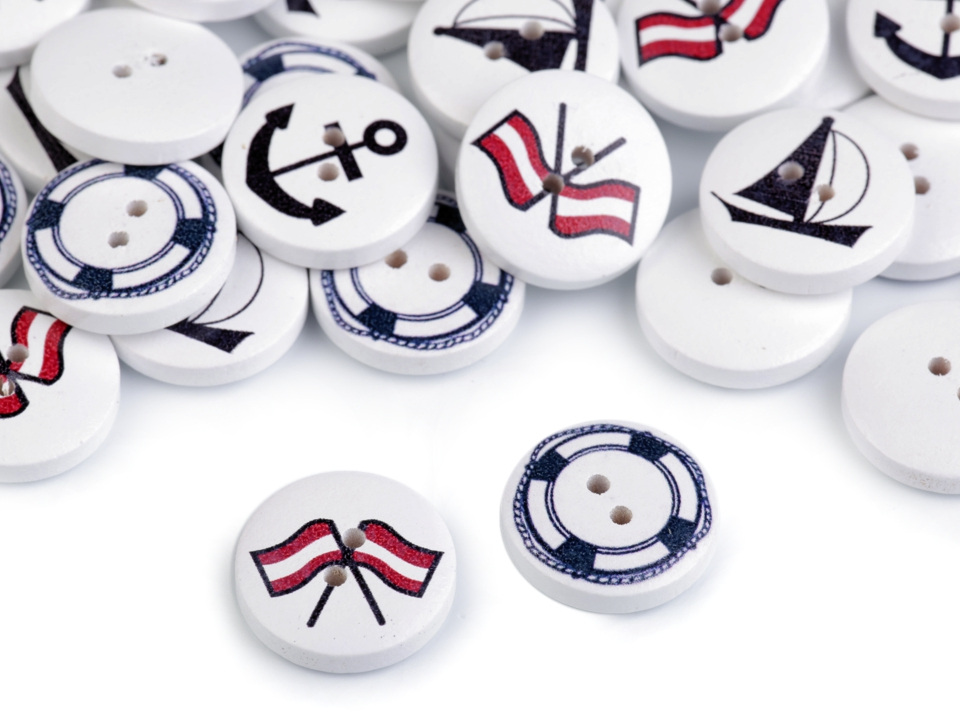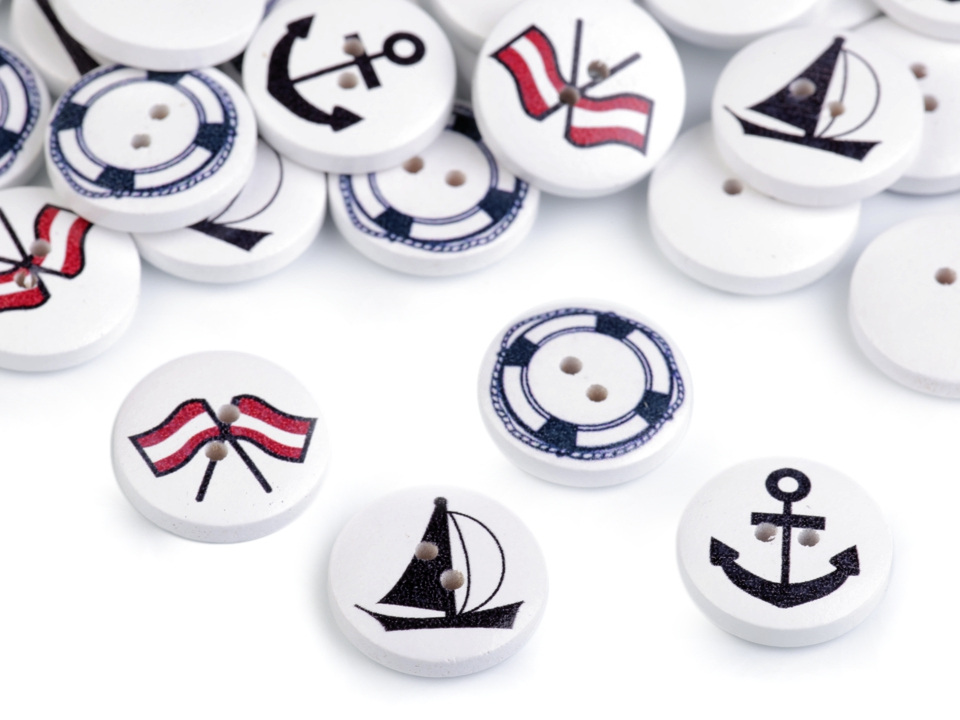Dřevěné knoflíky s potiskem námořních motivů jsou stále "in". Můžete je použít ve scrapbookingu a ozdobit s nimi foto rámečky, alba, deníky, přáníčka a pozvánky.