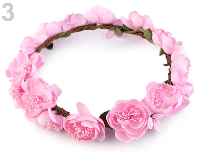 Květinový věneček s růžemi můžete nosit jako ozdobu vlasů nebo jej můžete použít k dekoračním účelům. Na věnečku najdete květy růží, jež jsou bohatě zdobené středovými pestíky. Jsou připevněné k drátěné kostře, která je obalená provázky a ovinutá prýmkem s lístečky. Díky drátěnému základu můžete věneček tvarovat, velice příjemně se nosí.