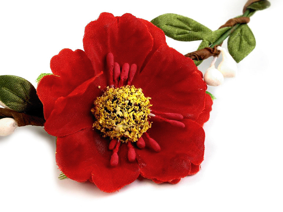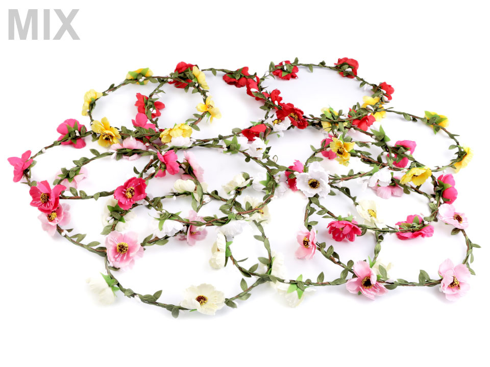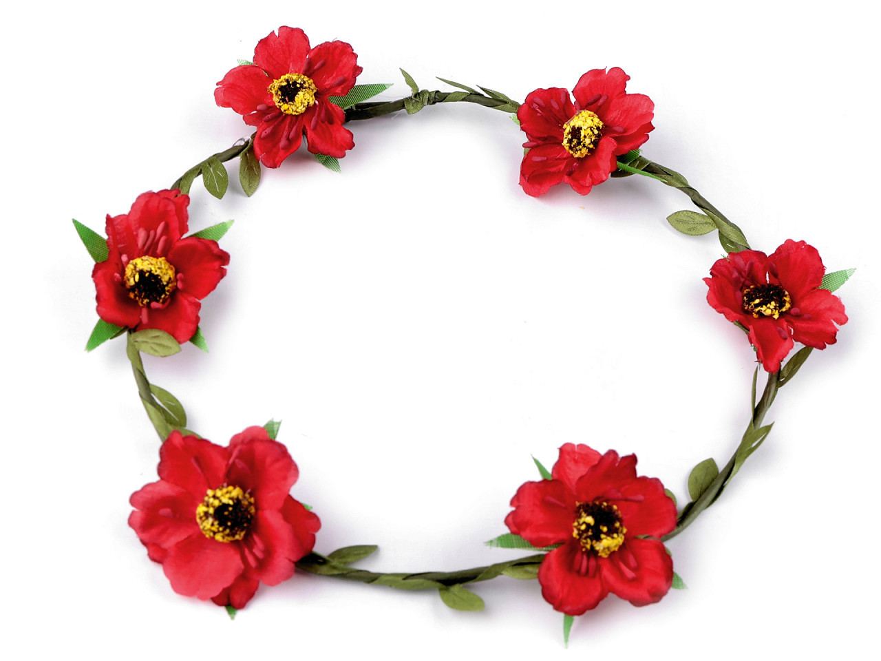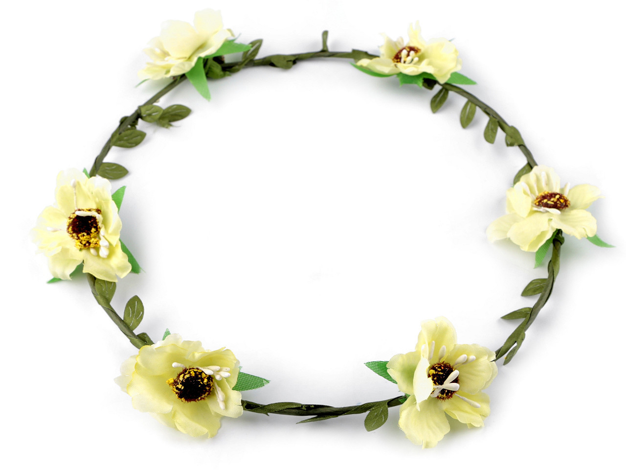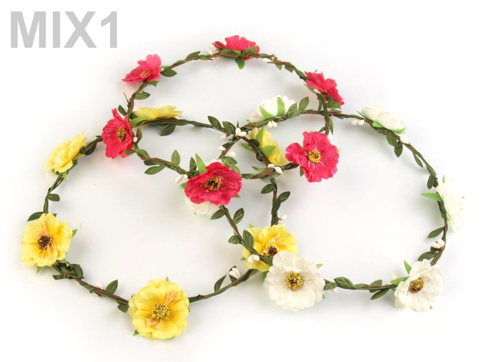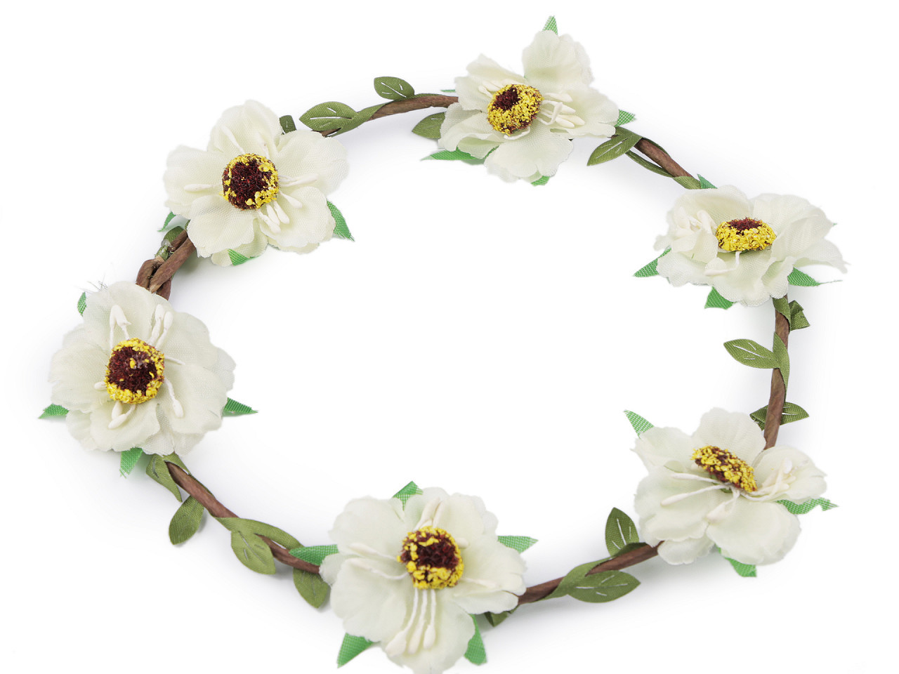Můžete jej nosit jako ozdobu vlasů nebo použít k dekoračním účelům. Květy vypadají jako živé. Jsou připevněné k drátěné kostře, která je obalená papírem a ovinutá prýmkem s lístečky. Díky drátěnému základu můžete věneček tvarovat, velice příjemně se nosí.