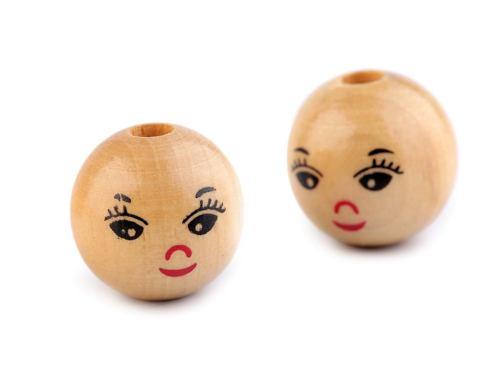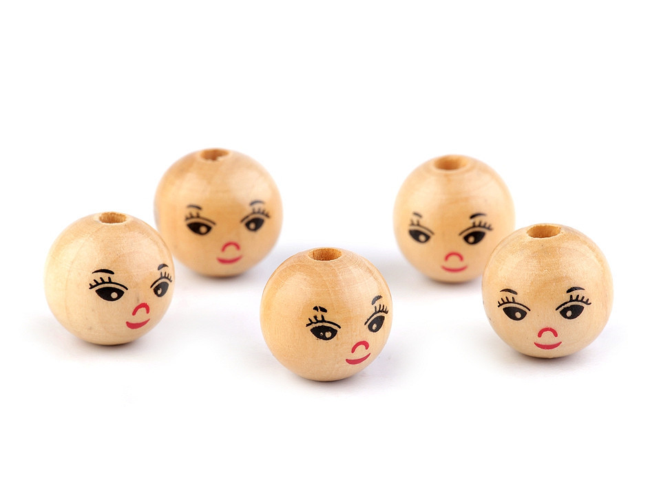 Dřevěné korálky s malovaným obličejem mají jemný lesk díky nalakování. S jejich pomocí si můžete vytvořit postavy andělíčků, uháčkovat panáčka, vytvořit veselý náhrdelník, vyrobit prstové maňásky, veselé zápichy do květináče apod.