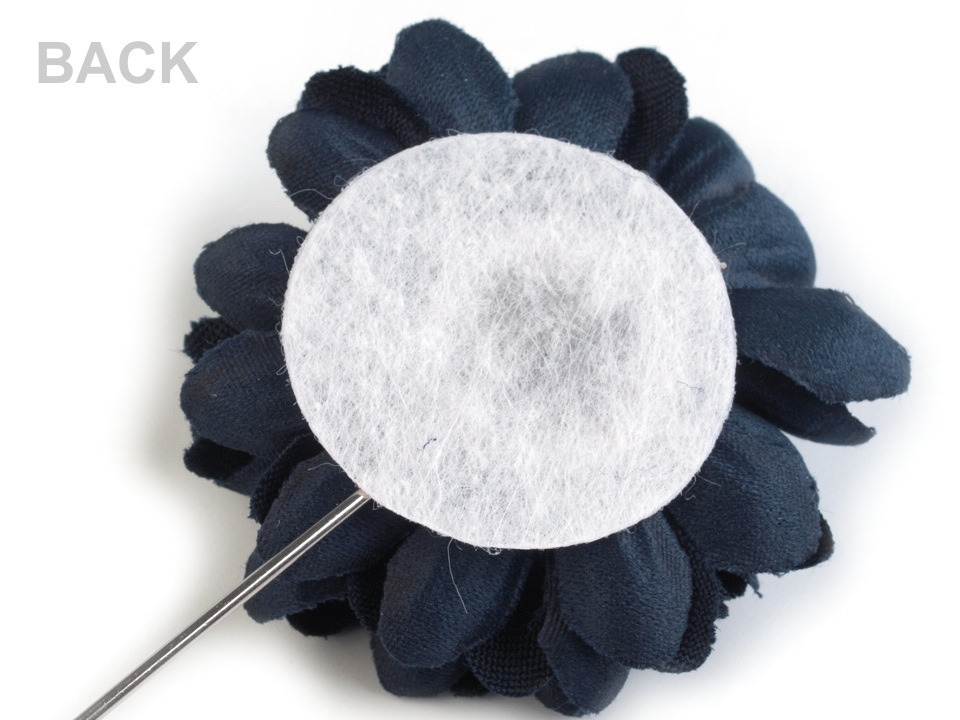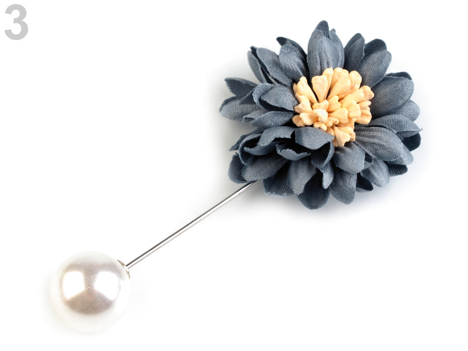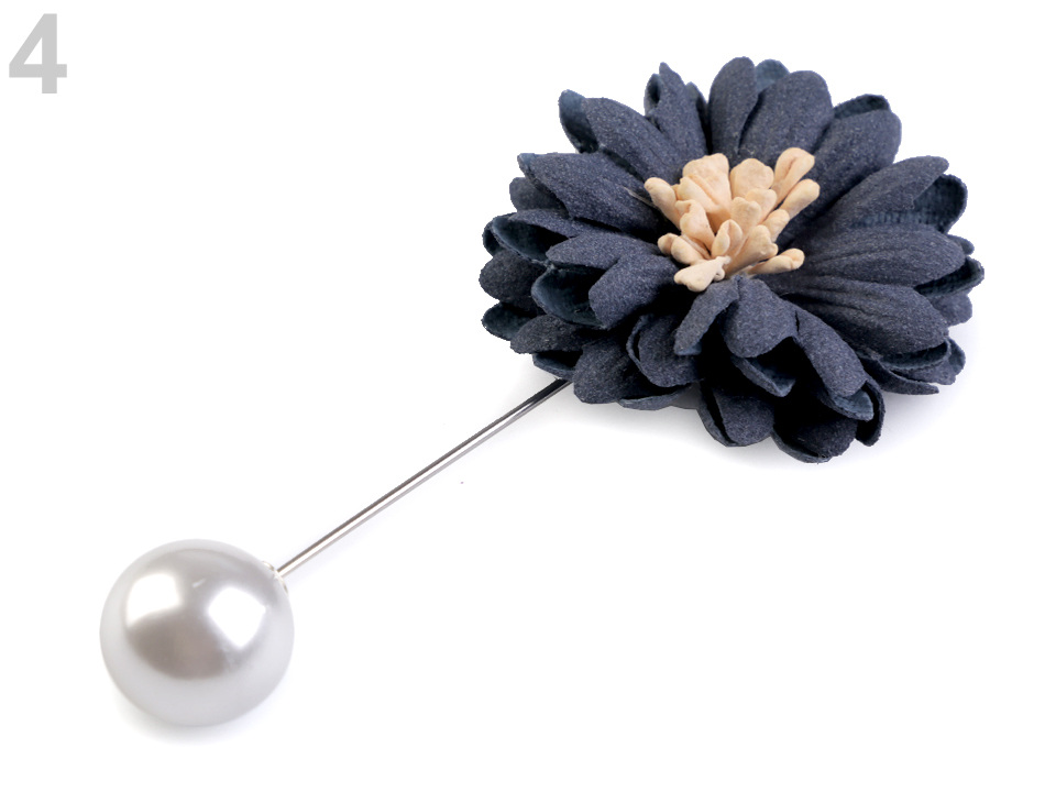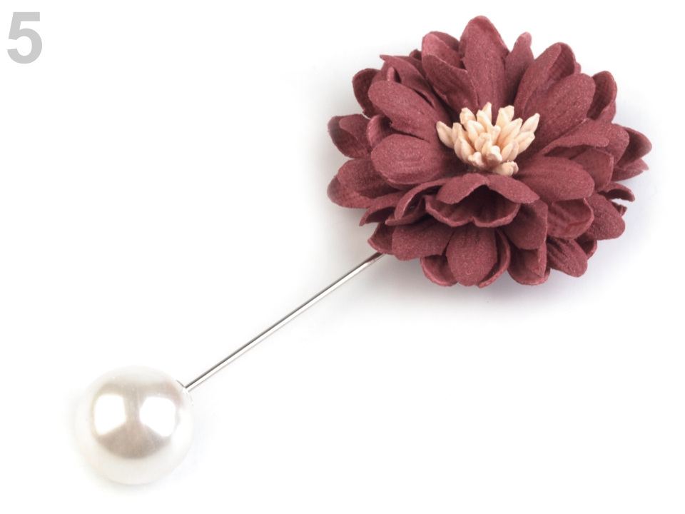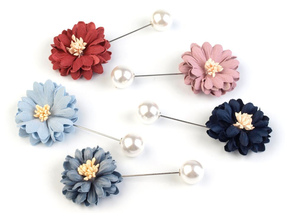 Květ má bohaté okvětní lístky, střed má ozdobený drobnými pestíky. Špendlík se na druhém konci zapichuje do velké plastové perly o průměru 1,5 cm.