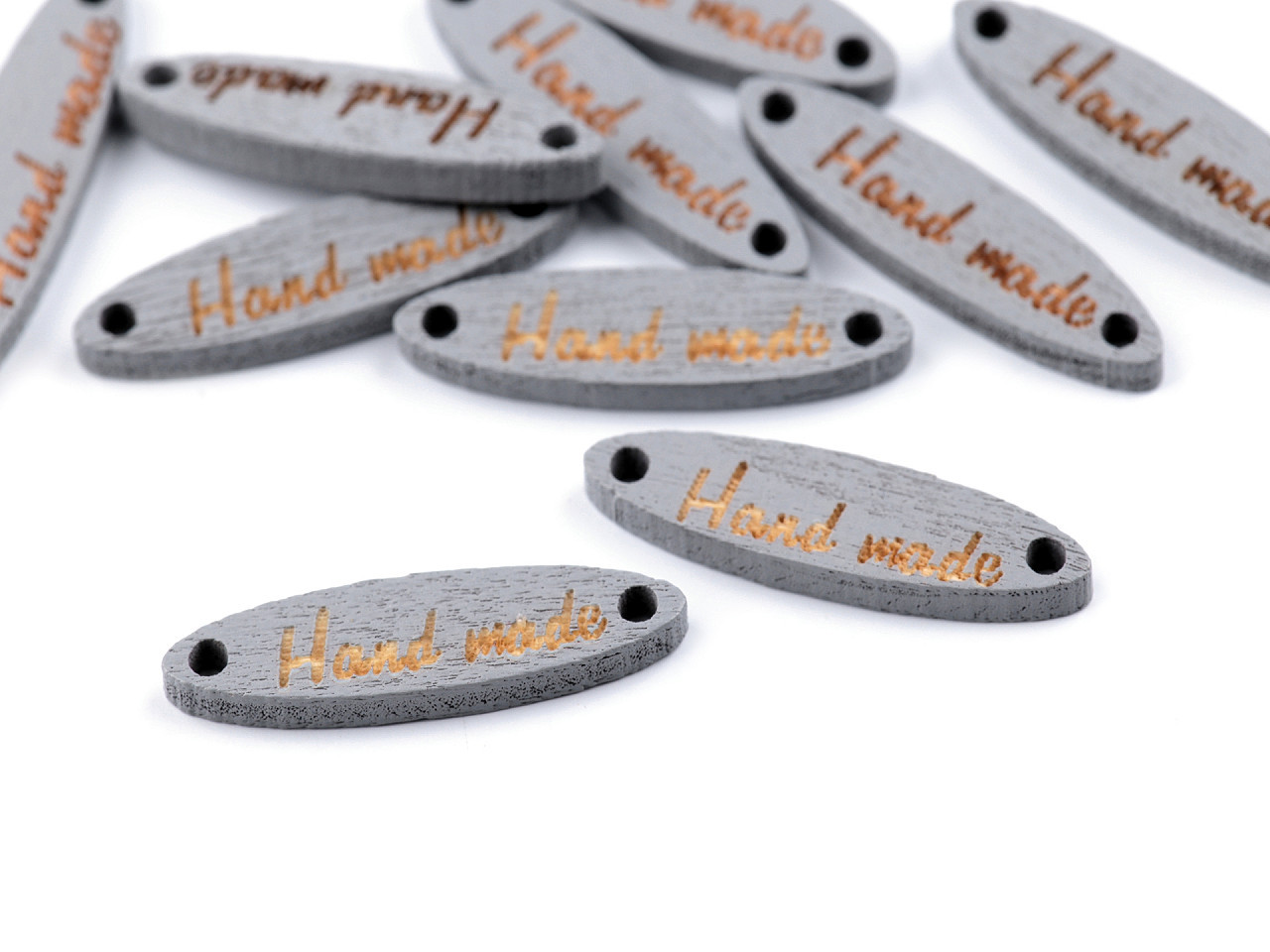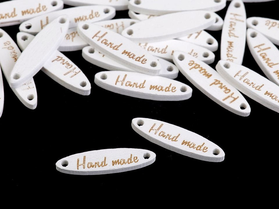 Dřevěnou cedulku oválného tvaru zdobí jednostranný nápis "hand made". Po stranách jsou dírky, kterými lze provléct šňůrku a cedulku tak pověsit na dekoraci.