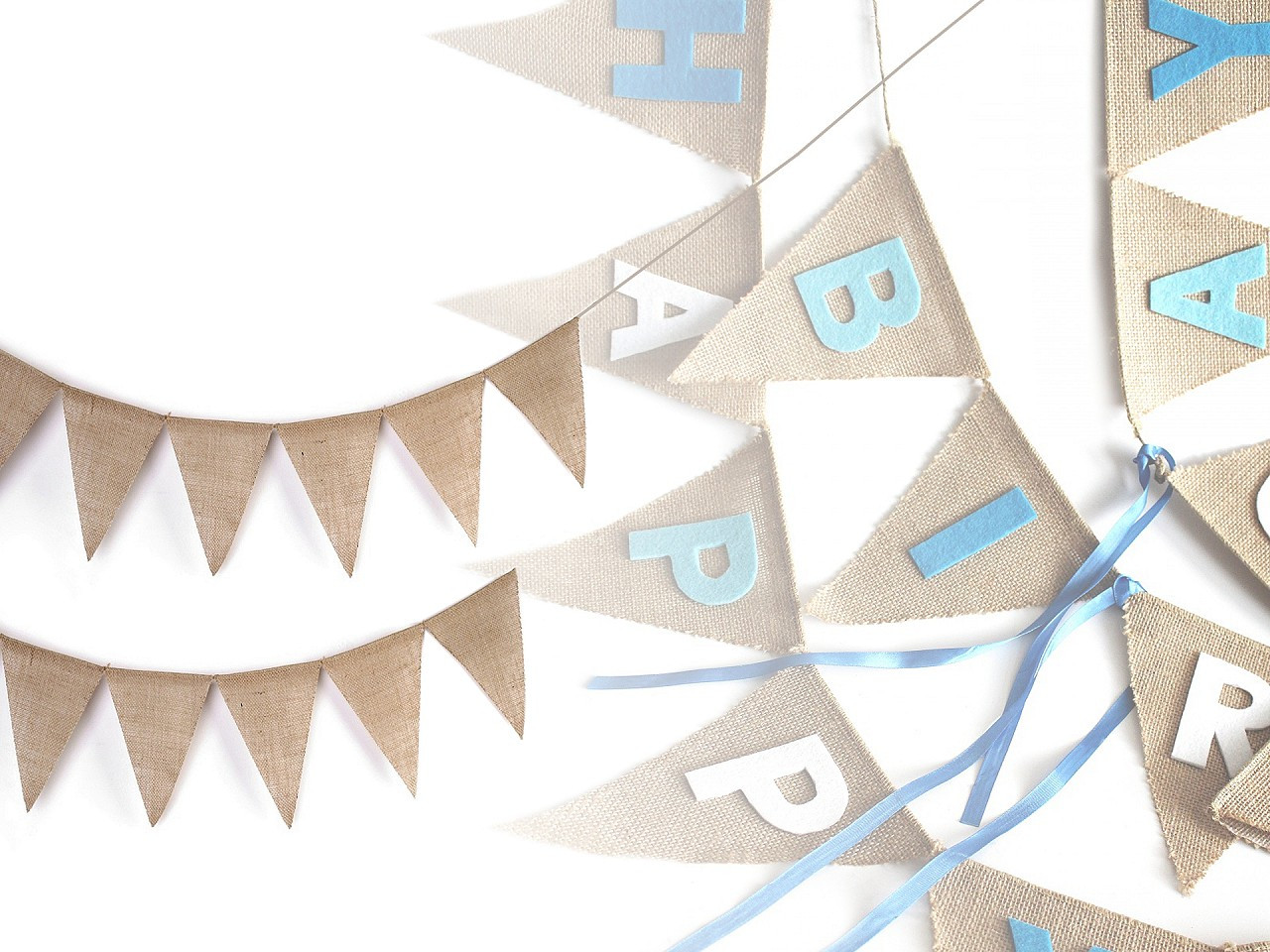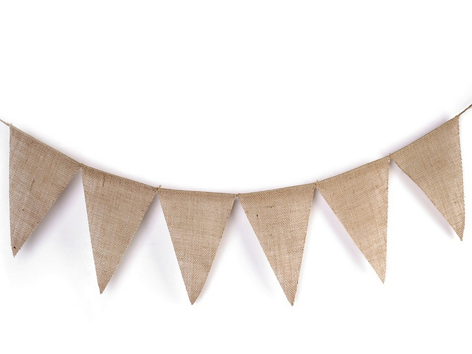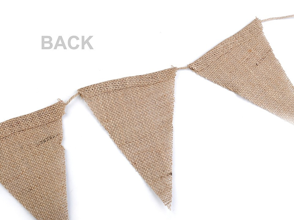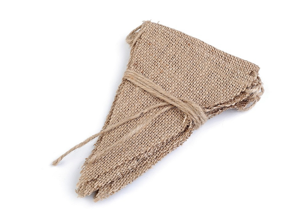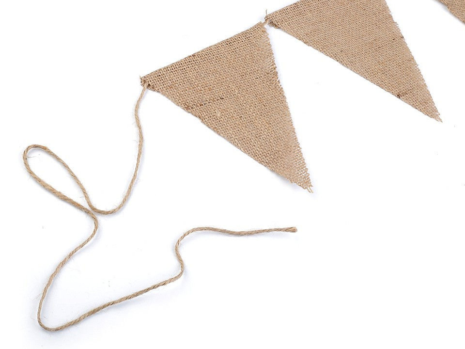 Závěsné vlajky z přírodní juty jsou skvělým doplňkem na párty, večírek či svatbu ve vintage nebo natural stylu. Dozdobíte-li je krajkou, získají romantický nádech. Vlaječky jsou připevněné na jutovém provázku.