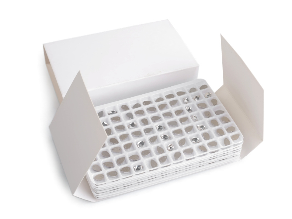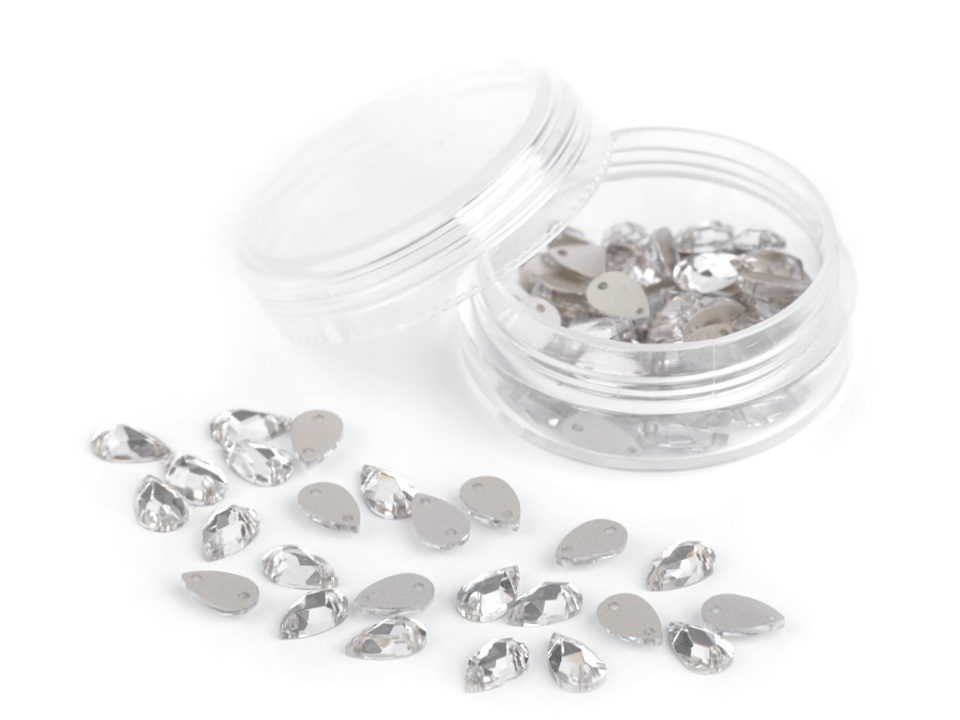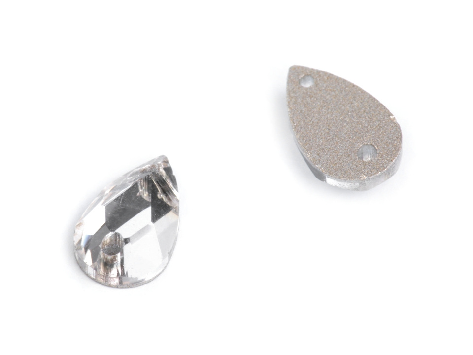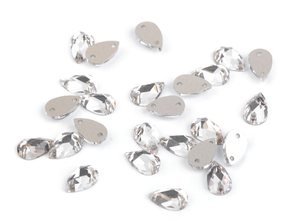 Skleněné kamínky ve tvaru kapky mají precizní výbrus, díky kterému se efektně třpytí. V každém kamínku jsou dva otvory, které umožňují snadné našívání. Oceníte je při výrobě šitých šperků nebo zdobení oděvů. Kamínky oslnivě vyniknou na společenských šatech, halenkách a doplňcích, jako jsou kabelky, psaníčka, klobouky apod.
