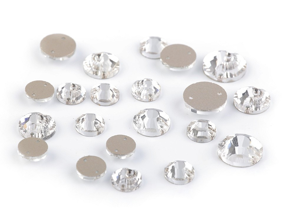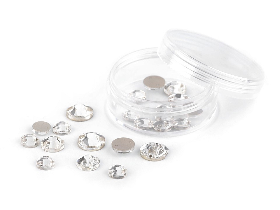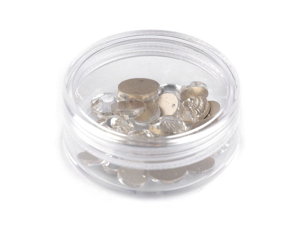 Mix kulatých, precizně broušených kamínků v dóze. Kamínky se efektně se třpytí. V každém jsou dva otvory, které umožňují snadné našívání.