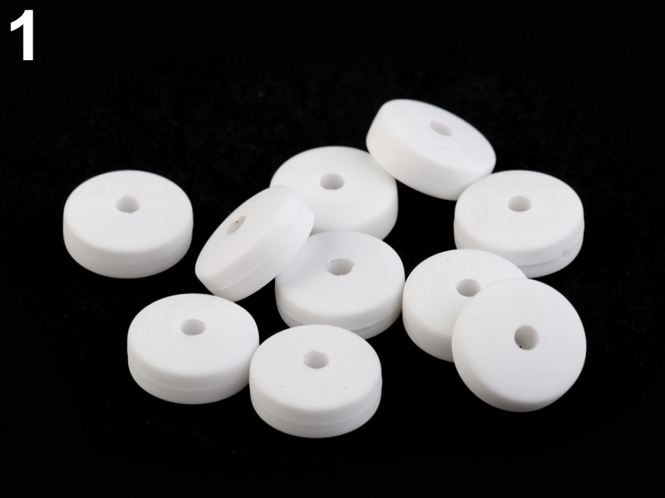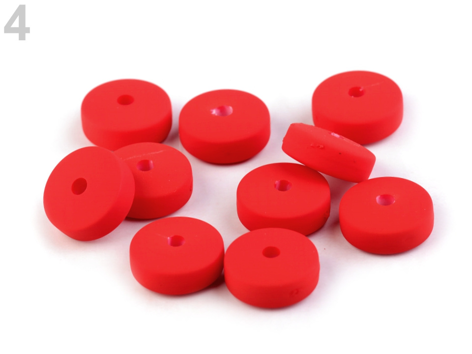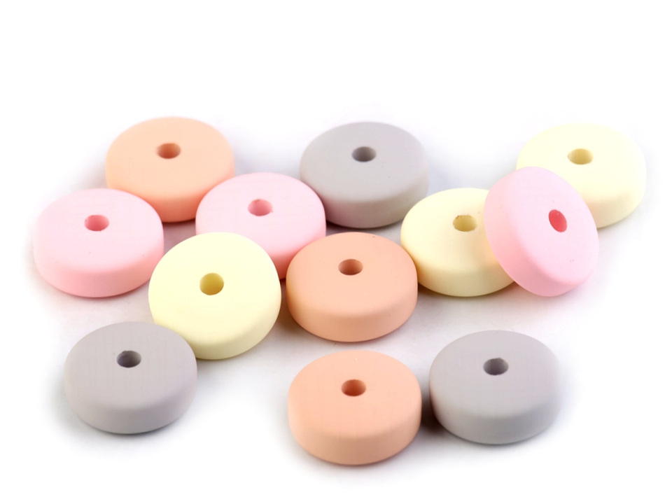Plastové korálky ve tvaru disku s matnou povrchovou úpravou. Na dotek jsou korálky velice příjemné, připomínají silikon.