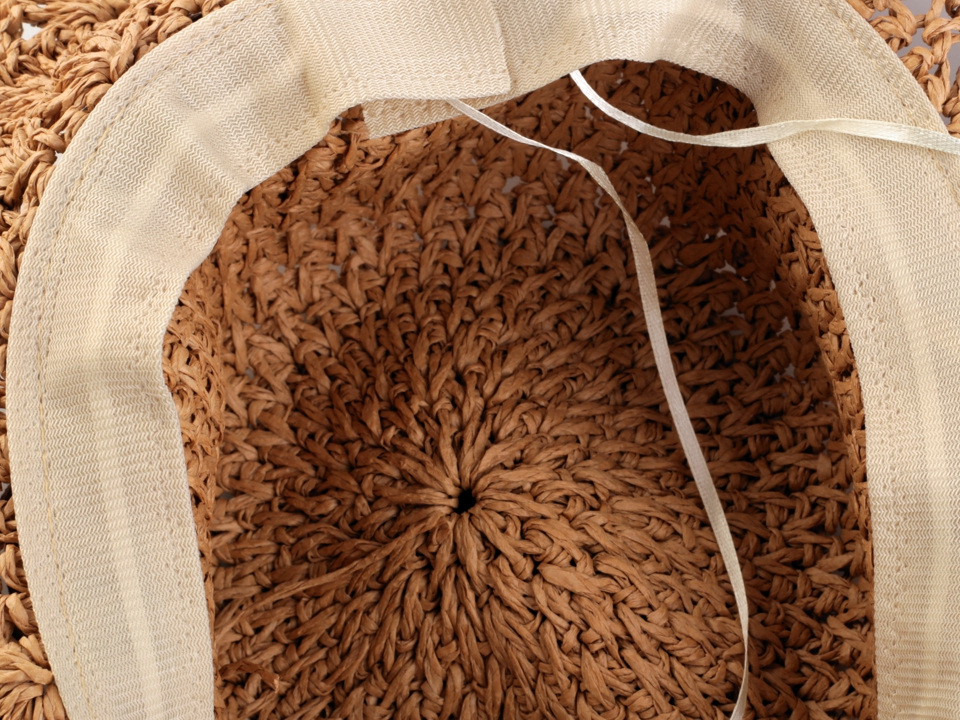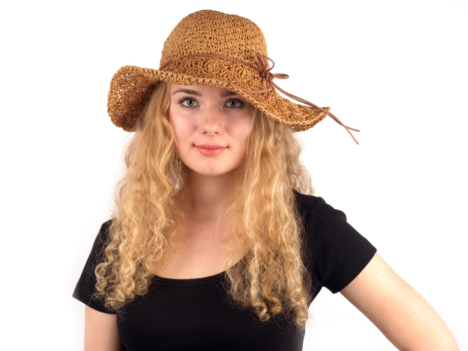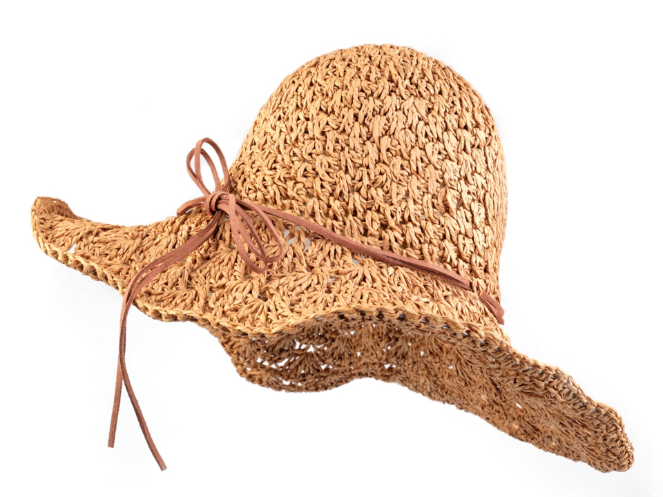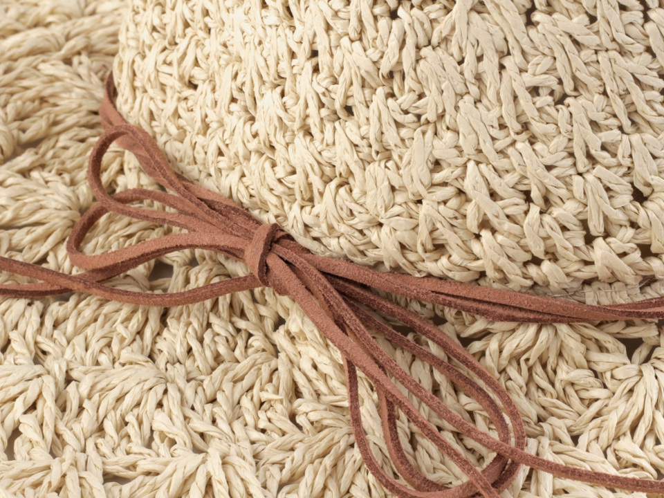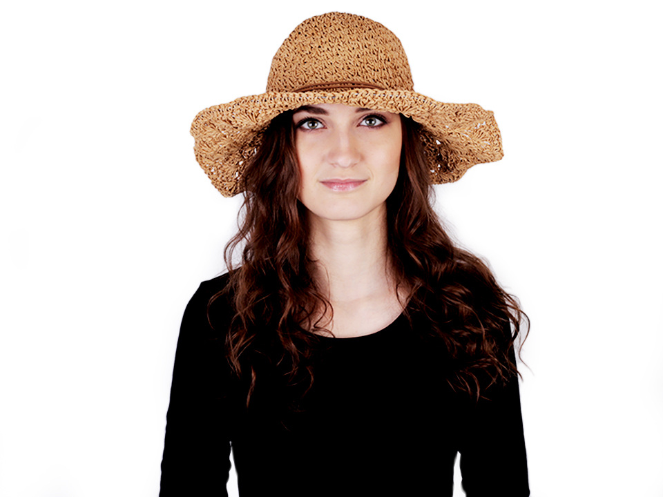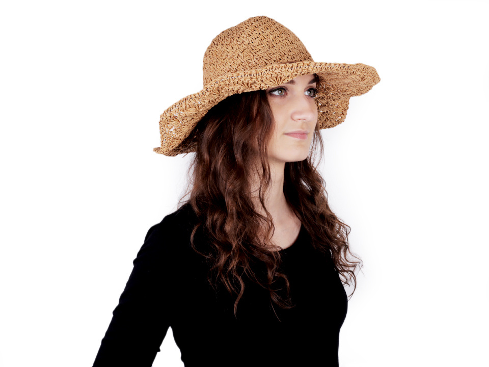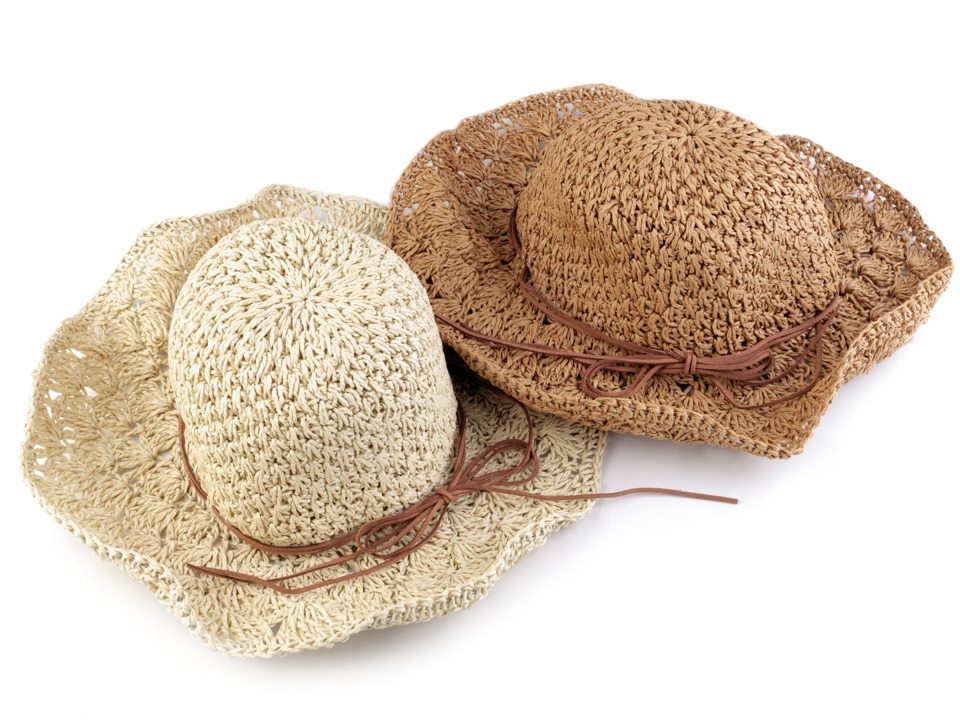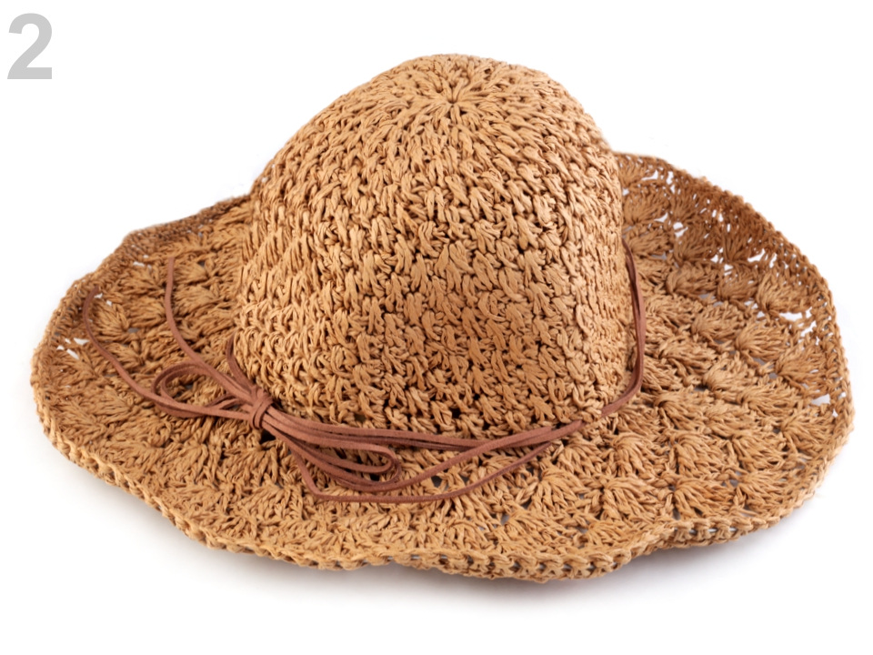 Klobouk má tvarovací krempu, její okraj je vyztužený drátem. Je zhotovený technikou háčkování, ruční, hand made výrobou, z pevného papíru. Dozdobený mašlí z provázků z eko kůže. Šířka krempy je 10 cm. Tvar je kulatý. Ve vnitřním potním pásku je stužka, díky které si můžete upravovat velikost klobouku. Klobouk je odolný proti pomačkání, skvěle se složí do kufru na dovolenou.