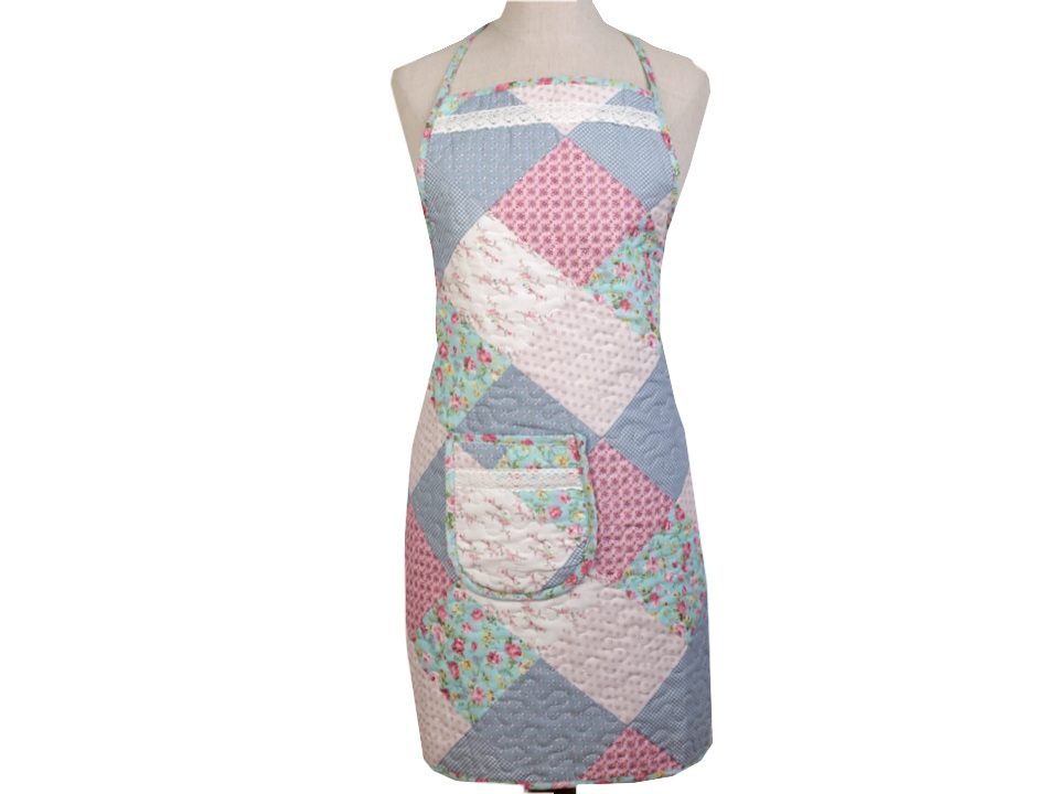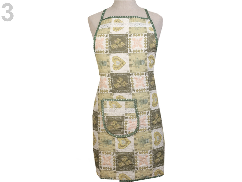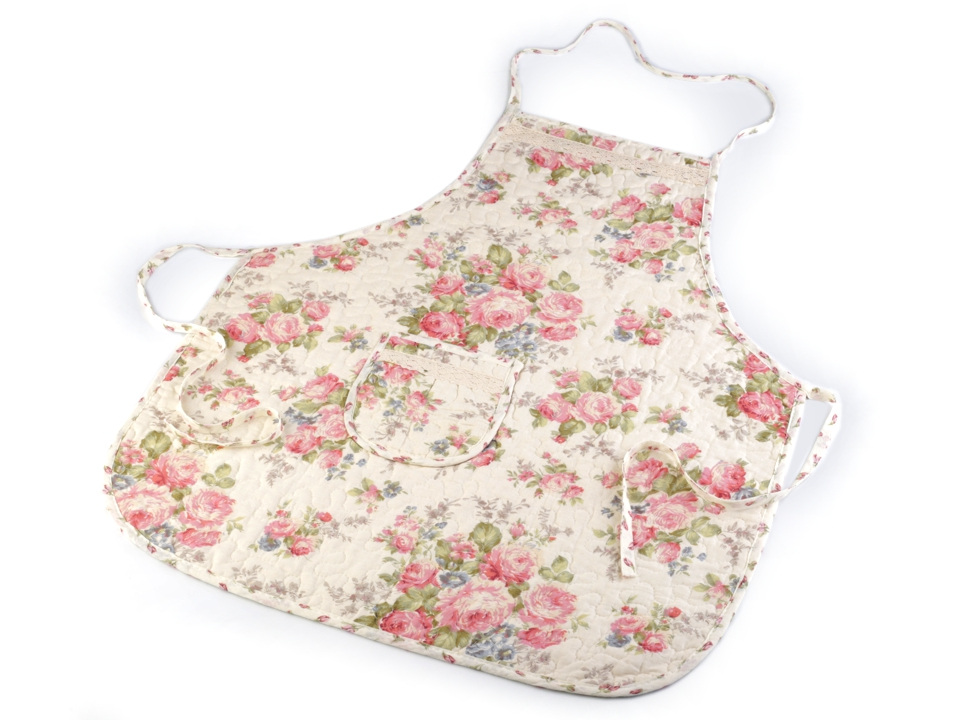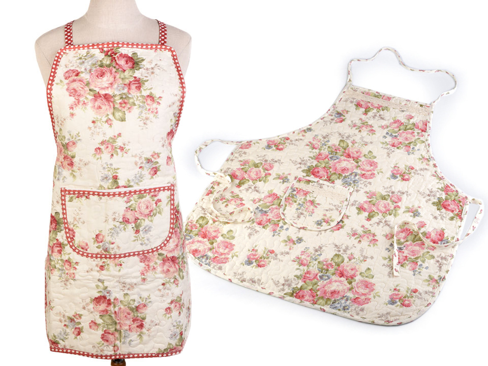 Oboustranná kuchyňská zástěra se zajímavým romantickým designem potěší všechny milovníky kuchařského umění. Na břiše má praktickou kapsu (15 x 15 cm) a na prsou je ozdobena slušivou krajkou. Látka má patchworkový potisk.