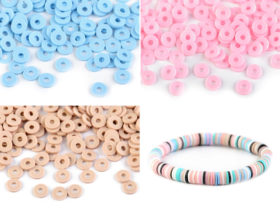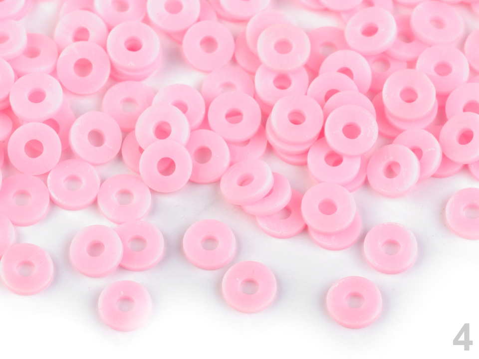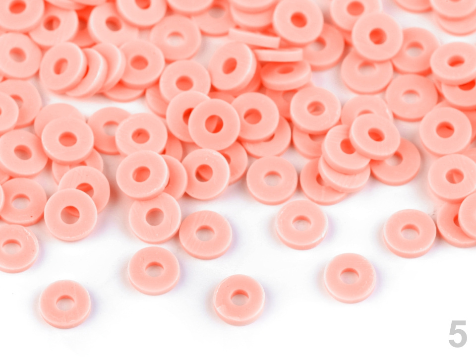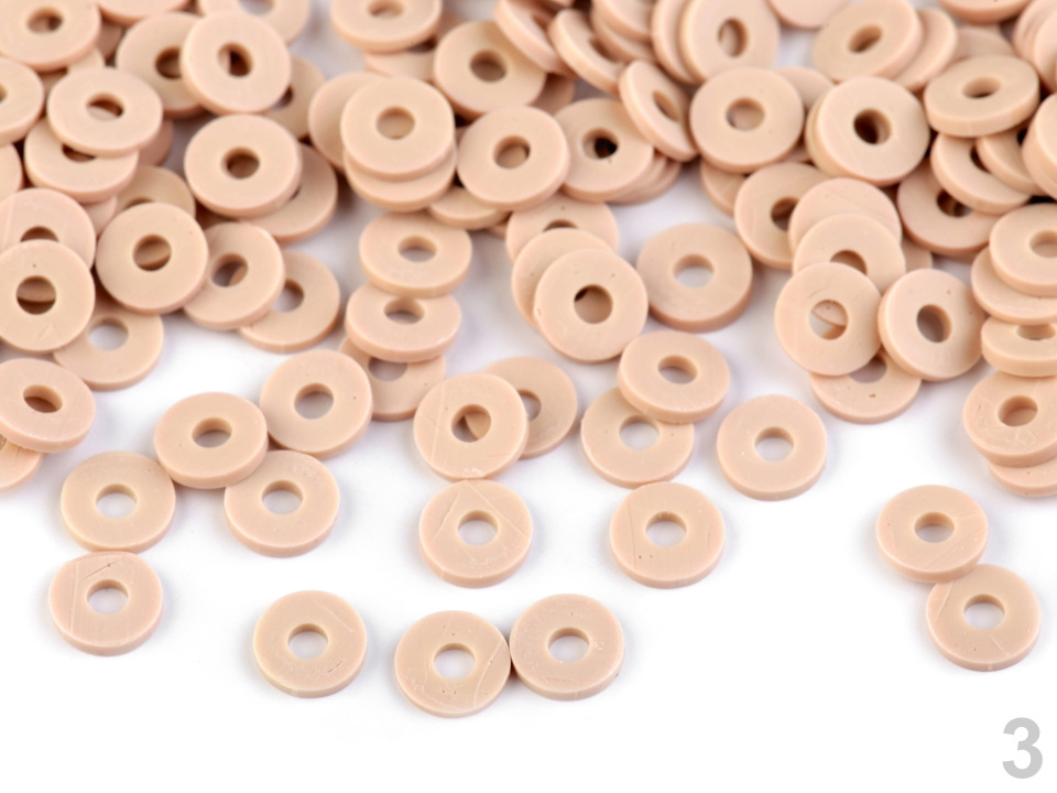 Tenké fimo korálky ve tvaru kroužku s matnou povrchovou úpravou.