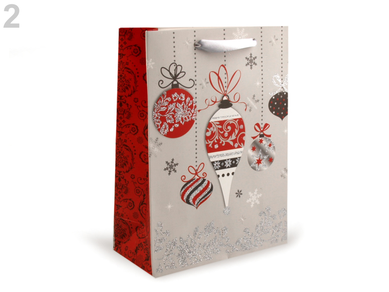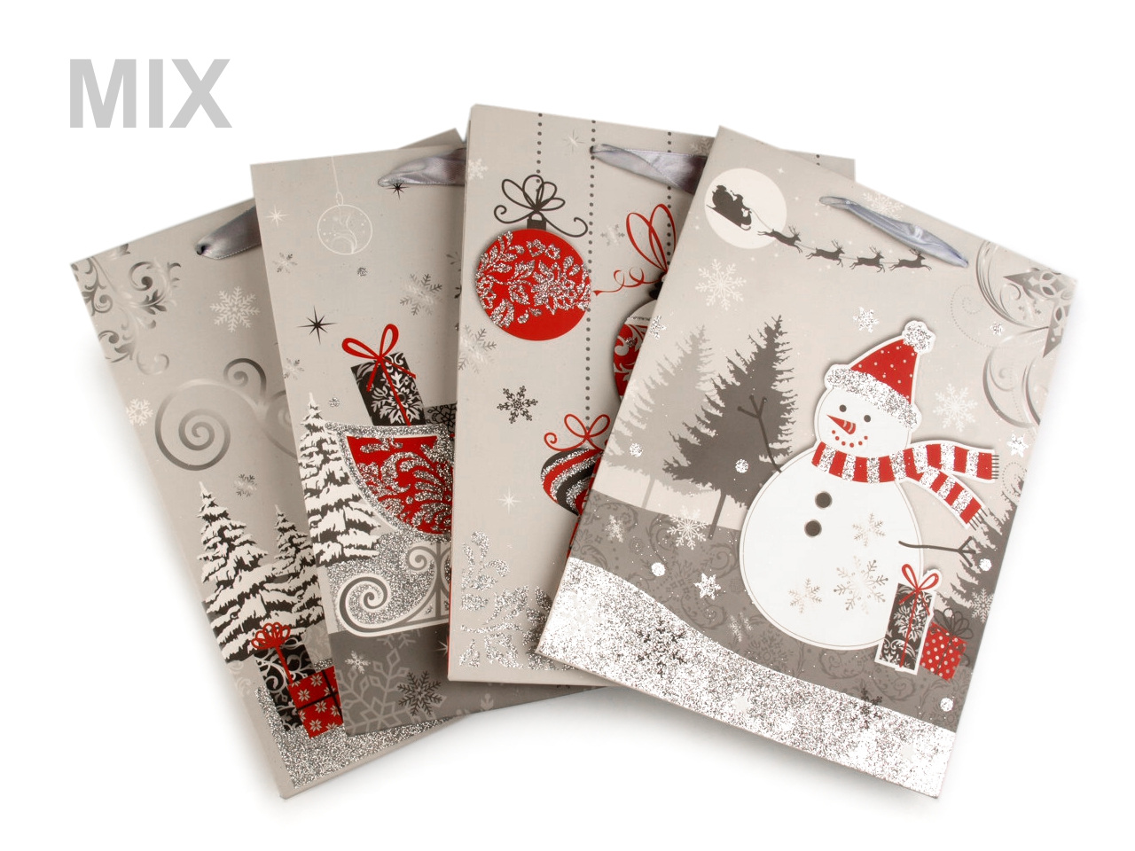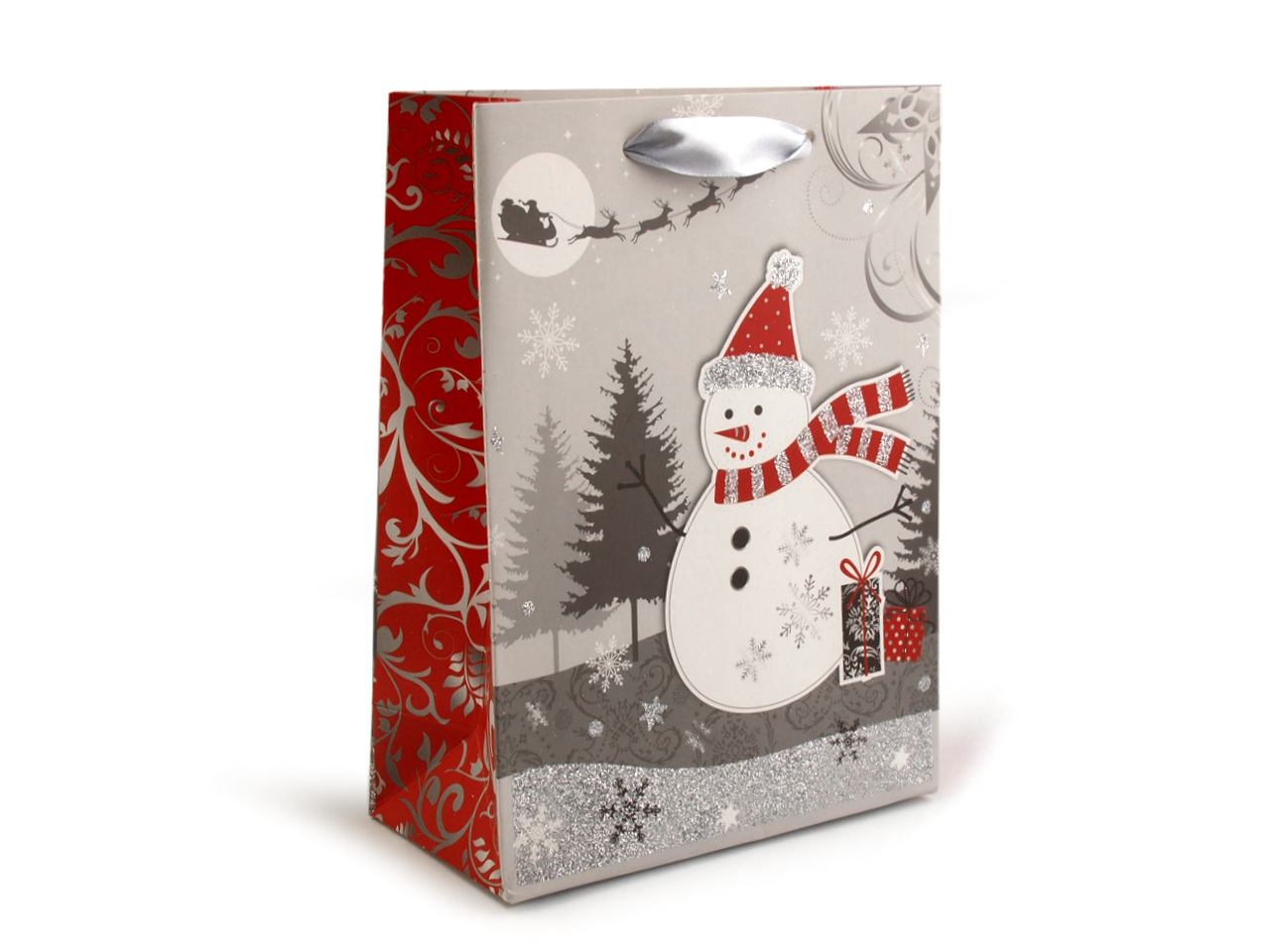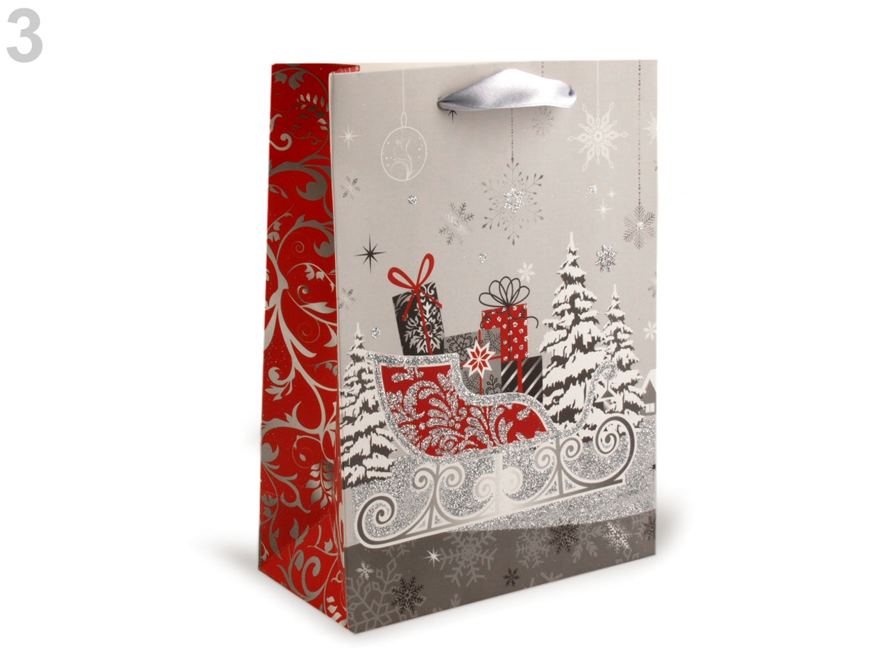 Dárkovou tašku zdobí vánoční motivy, které jsou z jedné strany zvýrazněny glitry. Zaujme vás také zajímavě zvolenou kombinací barev. Využijete ji na rychlé a vkusné zabalení dárku. Je vyrobená z pevného křídového papíru.