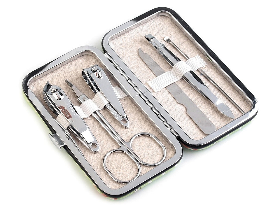 Manikúra obsahuje: nehtové nůžky, pilník, pinzetu, nástroj na zatlačení nehtové kůžičky a 2 kusy nehtových kleští.