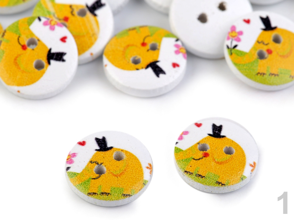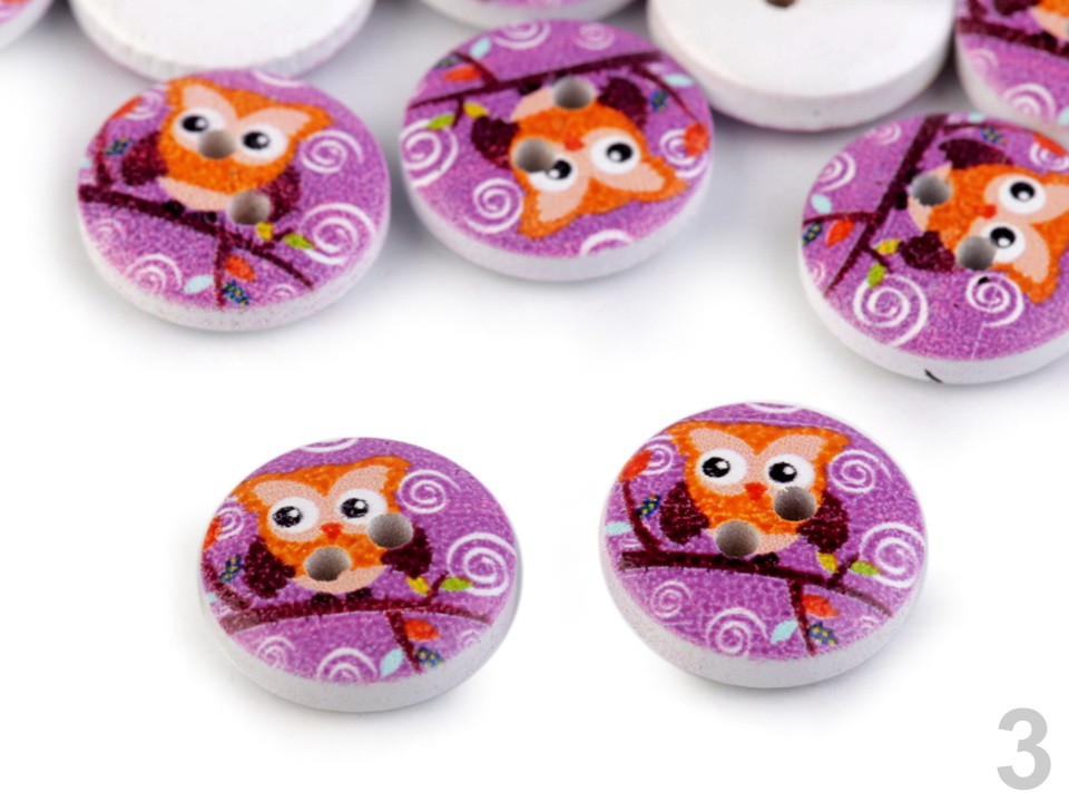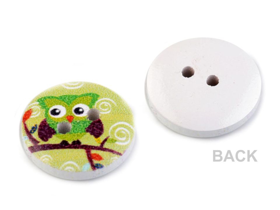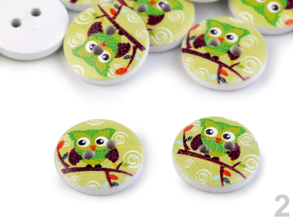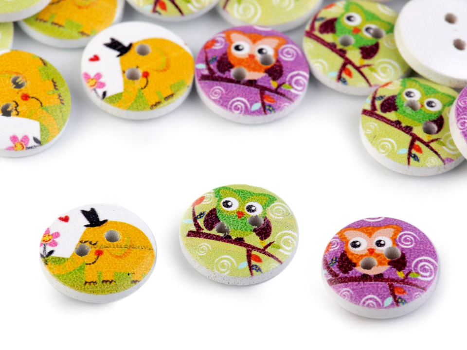 Dřevěné knoflíky s potiskem sovy nebo slona využijete hlavně ve scrapbookingu. Knoflík je možné přilepit lepidlem, oboustrannou lepící páskou nebo za pomocí dalších scrapbookingových lepících doplňků. Můžete je použít při výrobě přání, alb, koláží atd.