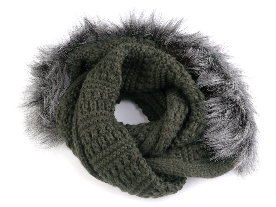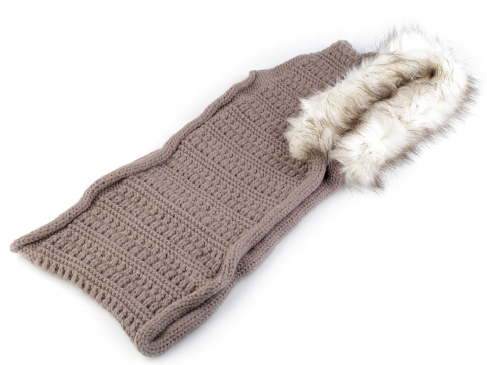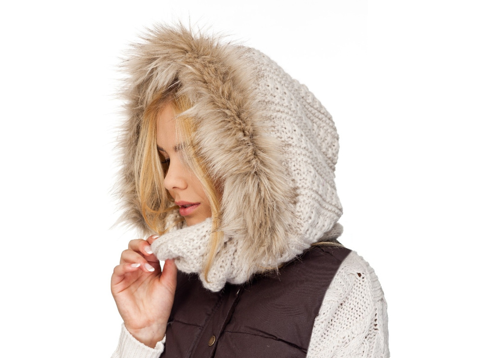 Pletený nákrčník s kapucí ozdobenou kožešinou bude ideálním společníkem v chladném počasí. Skvěle doplní jednobarevné kabáty i sportovní bundy. Hodí se do společnosti i na hory. Kapuci můžete nosit na hlavě nebo svěšenou přes ramena, vytvoří úžasný kožešinový límec.