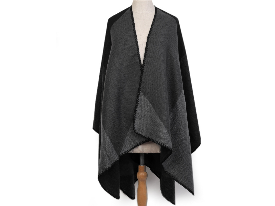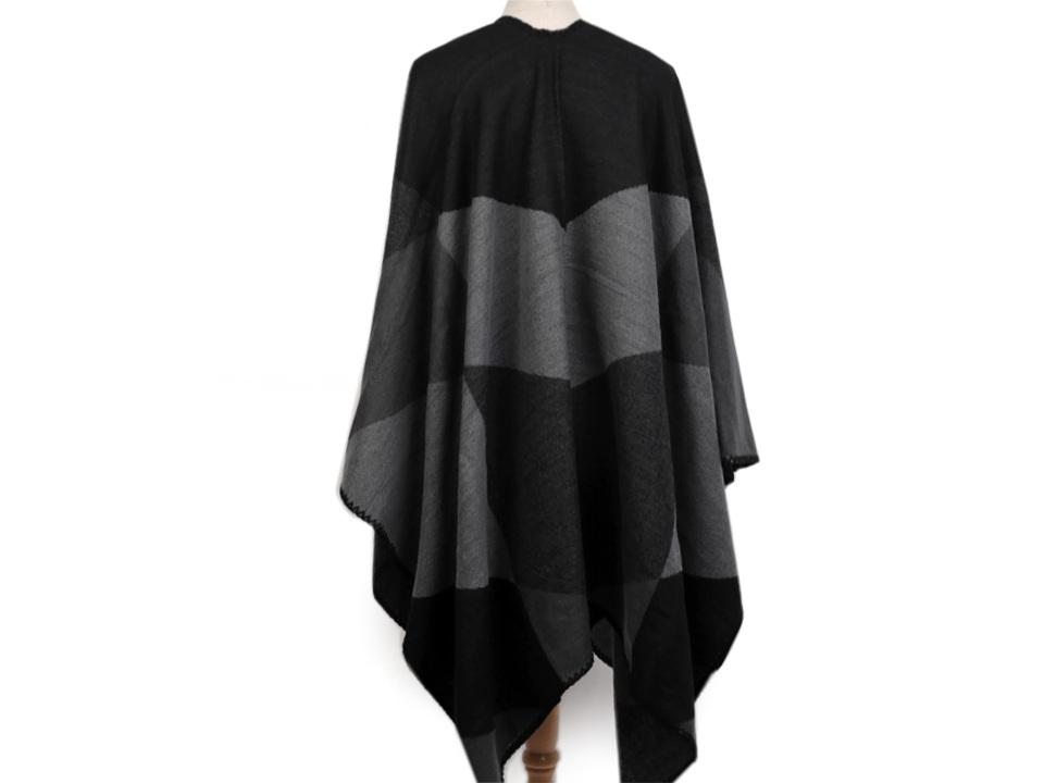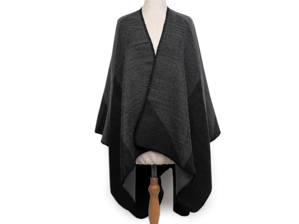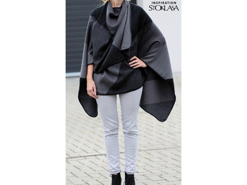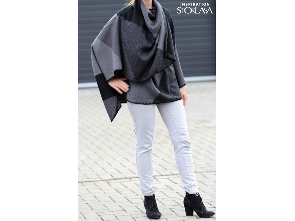 Příjemné oboustranné pončo je ozdobené velkými šikmými pruhy laděnými do šikmých kostek. Má jednoduchý, volný střih bez zapínání, stačí ho přehodit přes oblečení. Všechny okraje má obšité. Z jedné strany je vzor výraznější než z druhé. Je velice pohodlné, bez rukávů, bez zipů a knoflíků, tenhle praktický a hřejivý kousek by ve vašem šatníku neměl chybět.