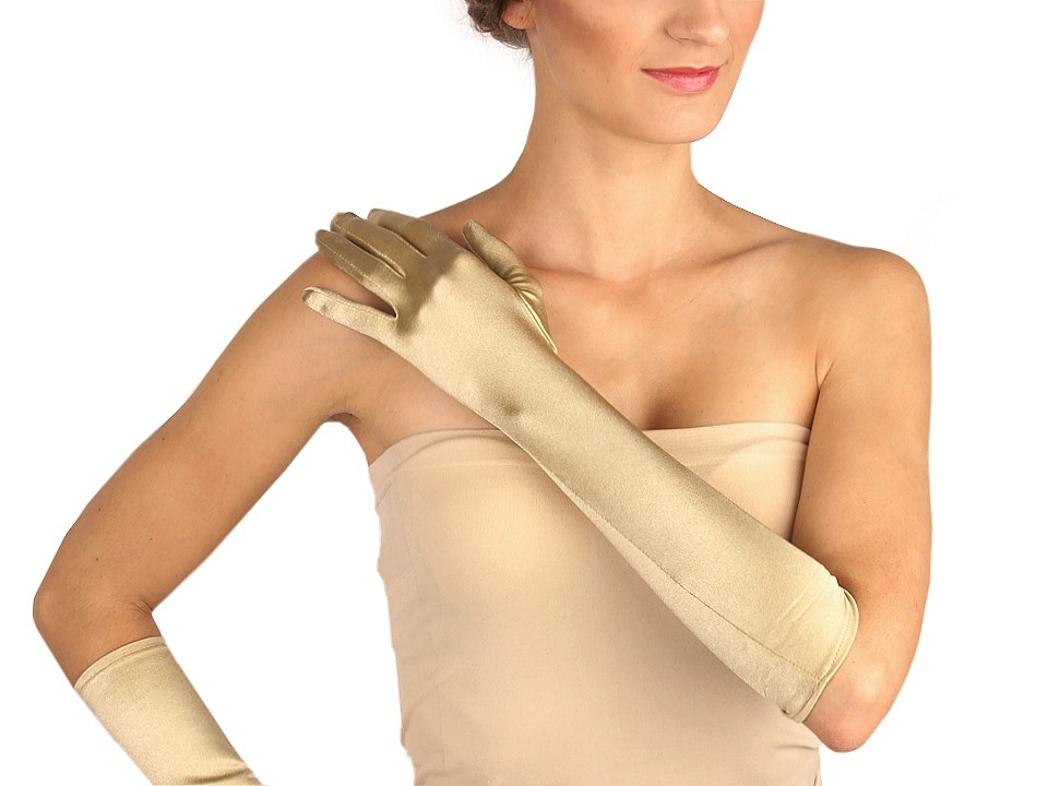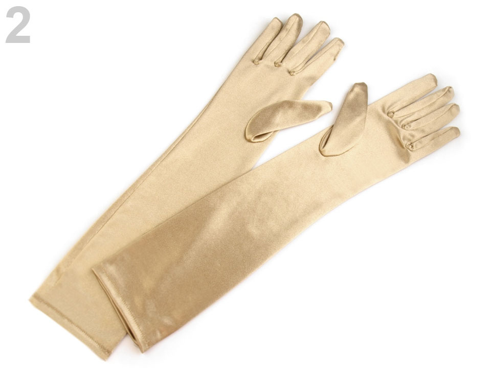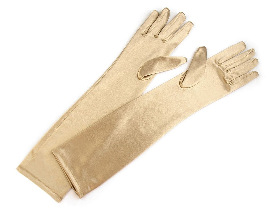 Zlaté saténové rukavice jsou ve společnosti nepřehlédnutelné. Díky své jednoduchosti jsou velice noblesní. Dodají finální šmrnc vaší róbě. Využijete je především na plesy, do divadla a na společenské večírky. Kvalitní elastický satén má jemný lesk, přizpůsobí se každé ruce.