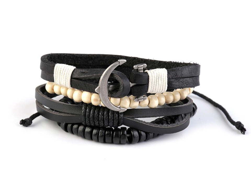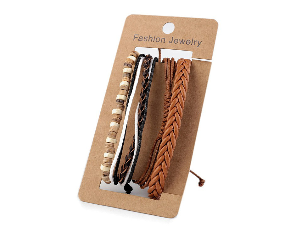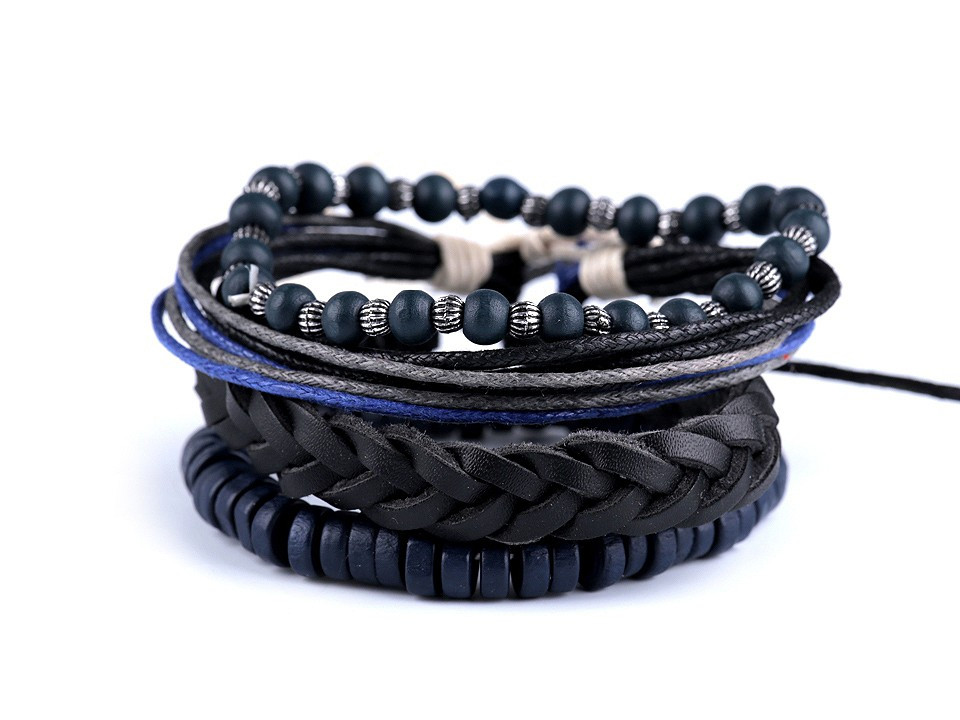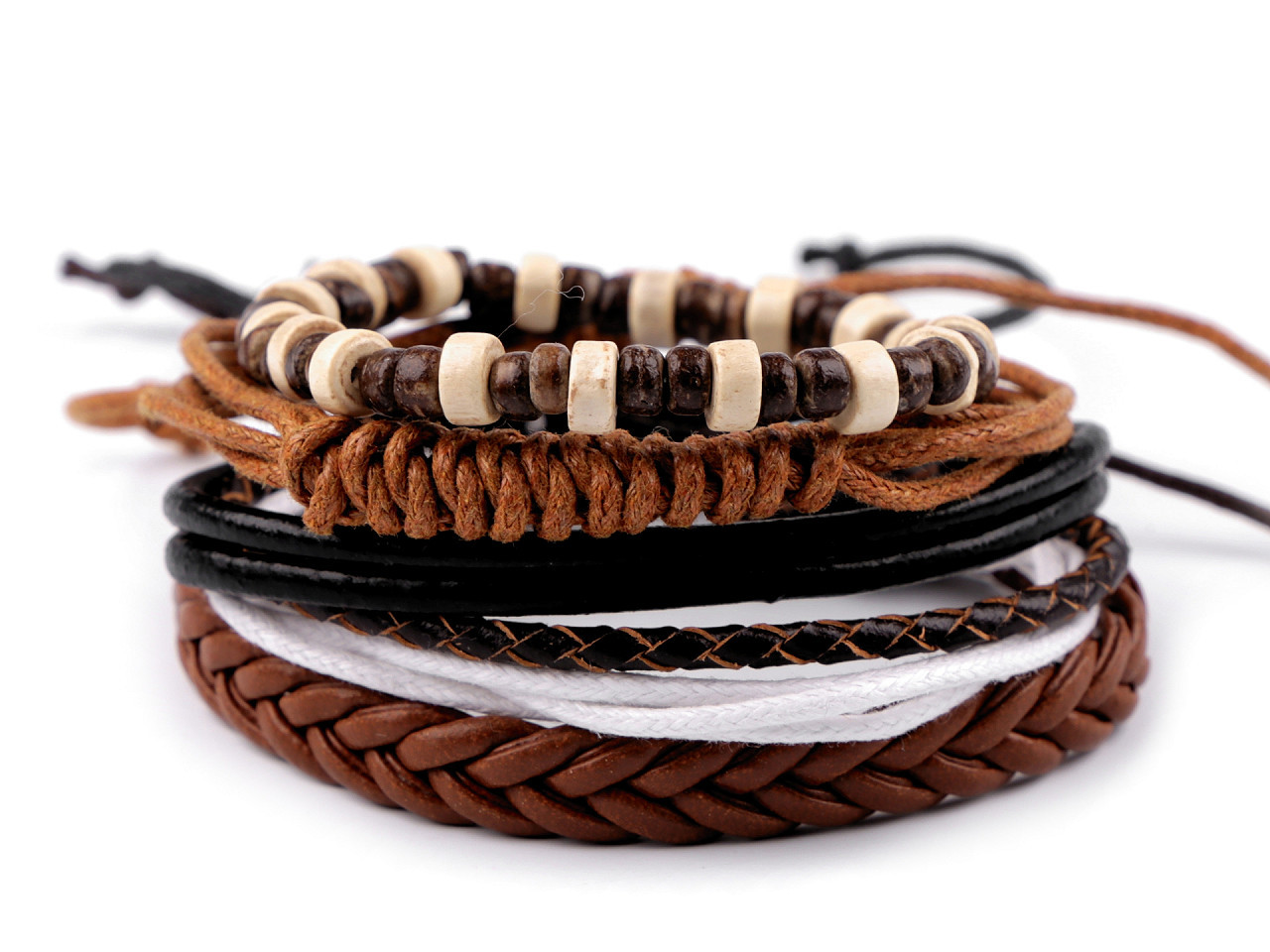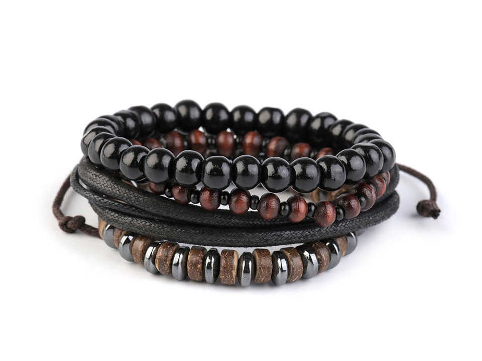 Elegantní a nepřehlédnutelná sada 4 navzájem sladěných náramků z eko kůže a dřevěných korálků v boho stylu. Můžete je nosit najednou nebo samostatně. Jsou vhodné pro ženy i muže - unisex.